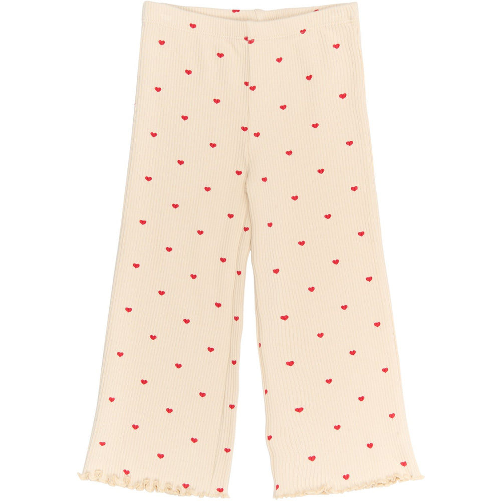 Disse legende THE NEW Siblings Gardenia AOP Rhea Wide Rib Bukser er fremstillet i GOTS-certificeret økologisk bomuld, der sikrer både komfort og kvalitet. Det heleækkende hjerteprint og de feminine salatkanter ved anklerne tilføjer en charmerende detalje, mens den elastiske talje garanterer en behagelig pasform hele dagen. Perfekt til legeaftaler eller afslappet hverdagsbrug. Matcher med TNSTRhea Rib Tee for et sødt sæt.