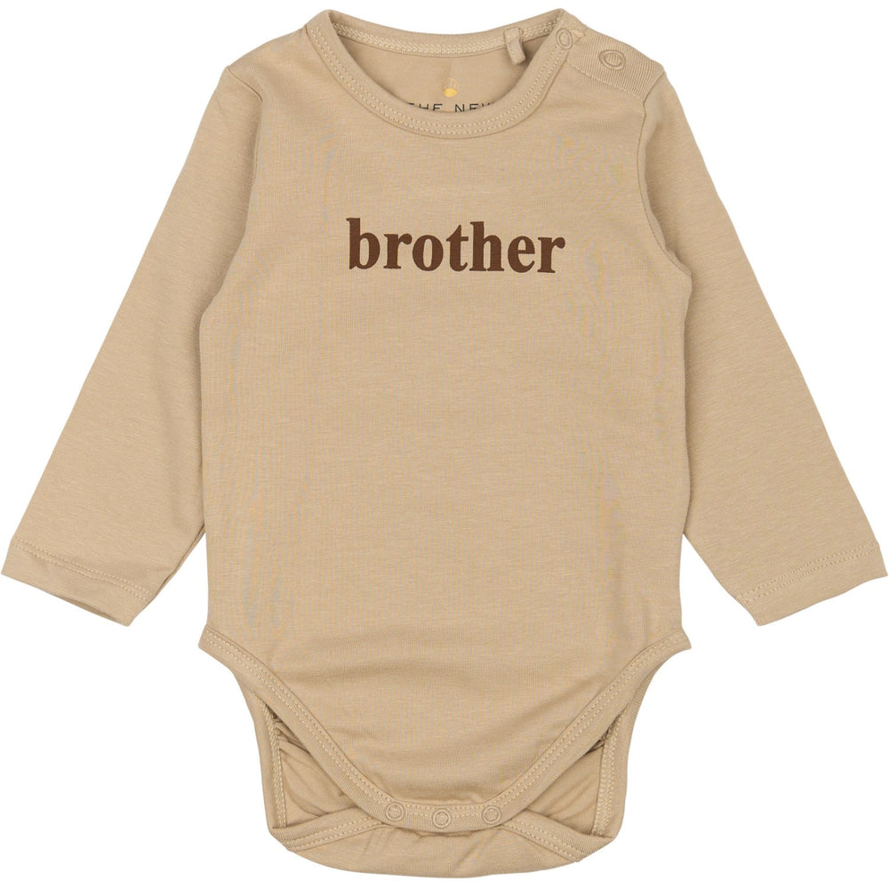 Denne charmerende langærmede babybody fra THE NEW Siblings er fremstillet i behagelig økologisk bomuld certificeret af GOTS (CU842535) og kommer i en lys sandfarve dekoreret med brun "bror" tekst. Designet sikrer en god pasform med praktiske trykknapper ved skridtet og skulderen for let påklædning. Perfekt til at matche med søster bodyen for et yndigt søskendelook. Ideal til hverdagsbrug, den giver komfort og stil til de små.