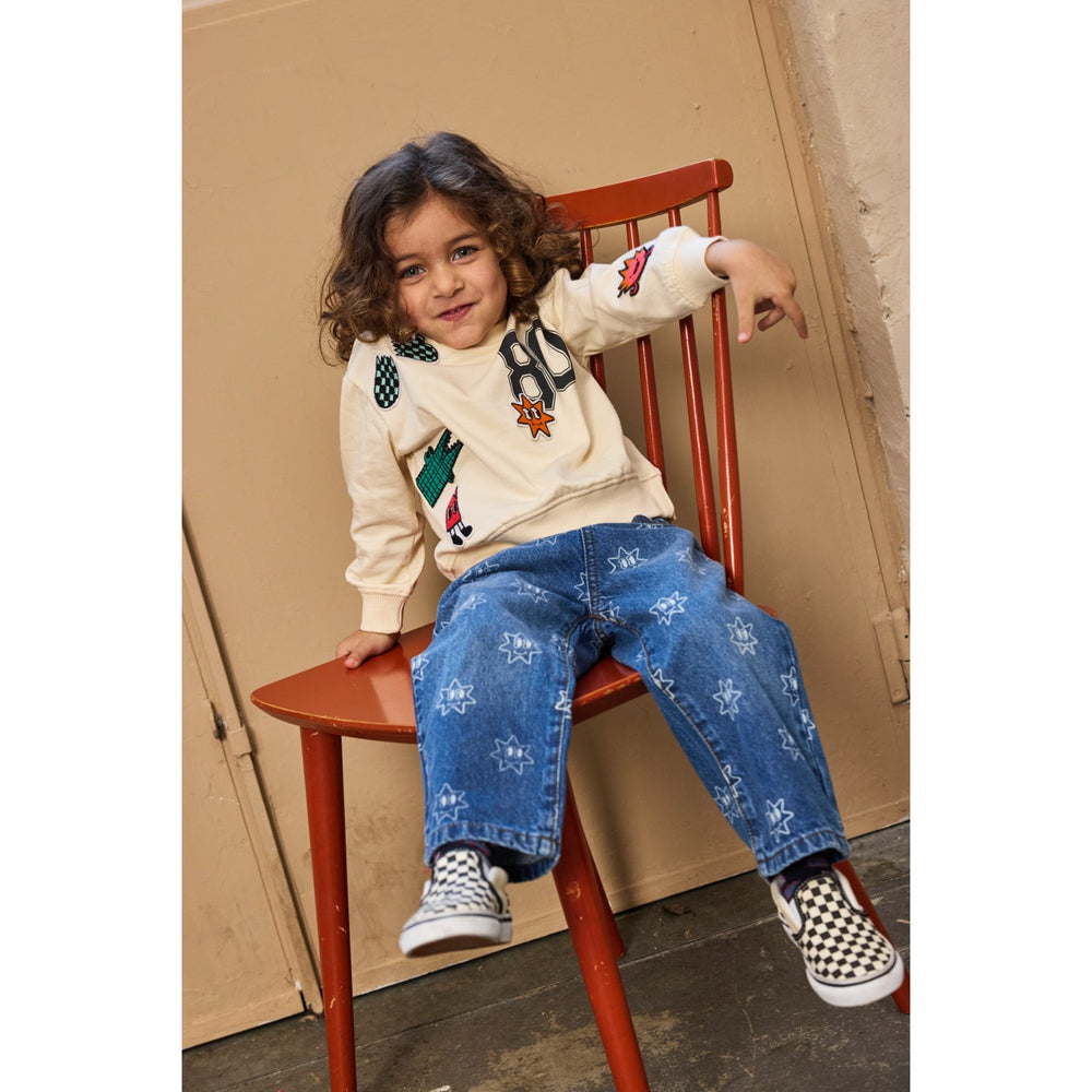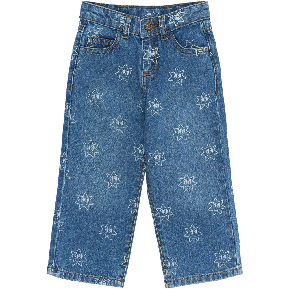 Disse brede ben jeans fra THE NEW Siblings er perfekte til den modebevidste unge. Med et unikt all-over print af stjerner, kombinerer de lethed med et moderne twist. Den justerbare linning og den rummelige pasform sikrer, at dit barn kan bevæge sig frit og komfortabelt hele dagen. Fremstillet i blødt, men holdbart denim, er disse jeans både funktionelle og stilfulde. Passer perfekt med den matchende denimjakke for at skabe et komplet og trendy sæt.