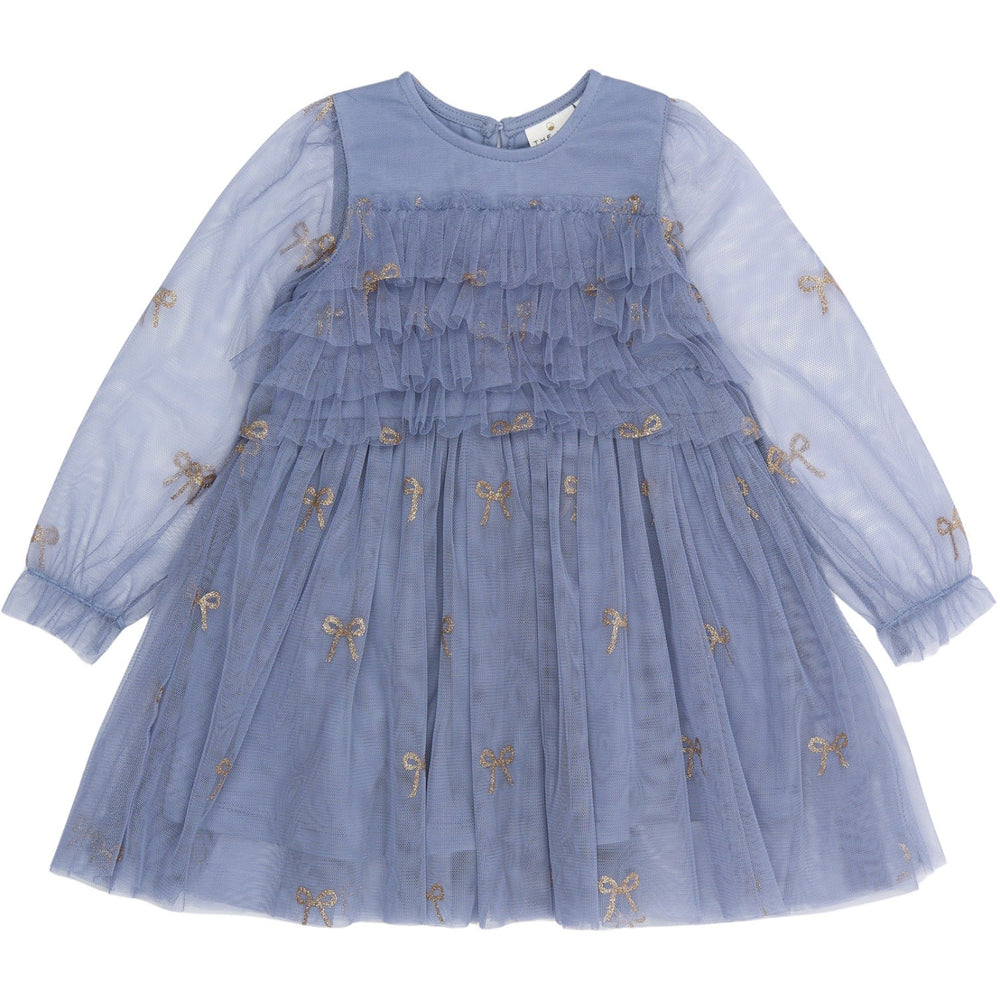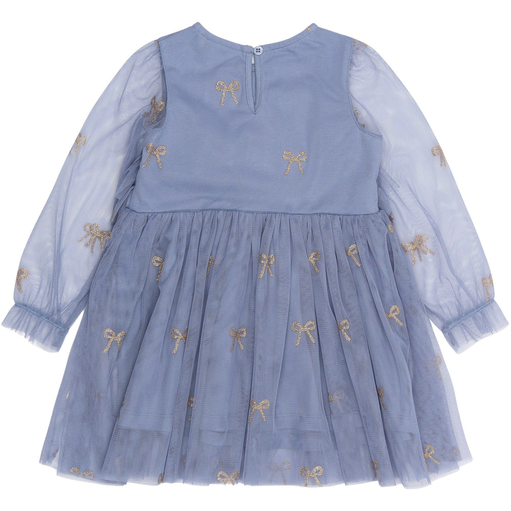 Denne charmerende kjole fra THE NEW Siblings er nøje designet til at berige enhver lille piges garderobe. Fremstillet af fint lagdelt tyl og prydet med elegante broderede sløjfer, tilbyder den både enestående stil og behagelig pasform. Det luftige design med lange, gennemsigtige ærmer og rynkede detaljer på brystet fremhæver kjolens delikate femininitet. Med sin brede og komfortable silhuet er denne kjole ideel til alt fra festlige anledninger til legende udklædningsdage.