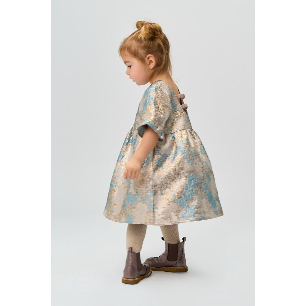 Lad dit barn opleve elegancen med denne charmerende kjole fra THE NEW Siblings. Fremstillet i øjenfangende jacquardstof, pryder det skinnende blomstermotiv hele stykket, tilførende et festligt præg til enhver begivenhed. Kjolen er designet med en luftig silhuet og korte, flagrende ærmer, som sikrer en stilfuld, men fri bevægelighed. Ideel til både festligheder og særlige oplevelser, kombinerer denne kjole komfort med sofistikeret stil, så de mindste kan føle sig både smukke og behagelige.