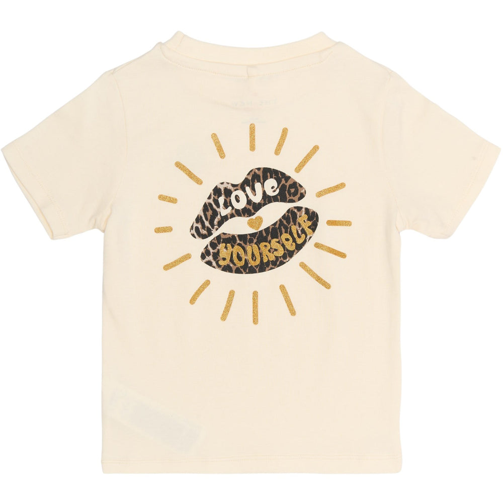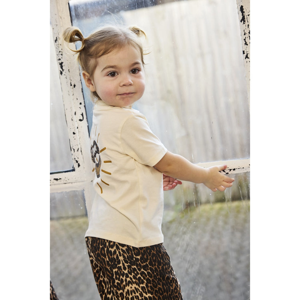 Blød og charmerende, denne T-shirt fra THE NEW Siblings er perfekt til dit barns garderobe. Fremstillet af 95% økologisk bomuld og 5% stræk, tilbyder den både åndbarhed og fleksibilitet. Det unikke print med læber og dyreprint, pyntet med guldglimmer, tilføjer et spændende og stilfuldt udtryk. GOTS-certificeringen sikrer, at materialet møder strenge miljø- og sociale kriterier. Ideel til hverdagsbrug og leg, med en behagelig almindelig pasform og korte ærmer.