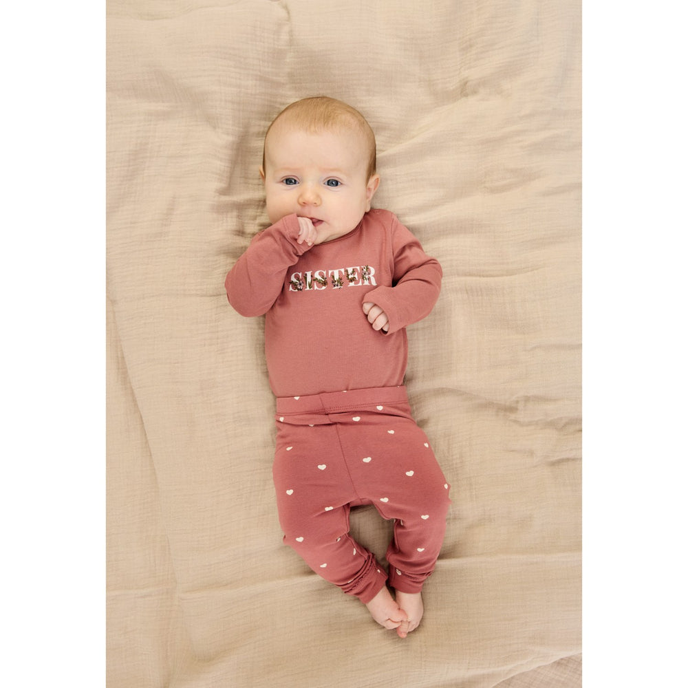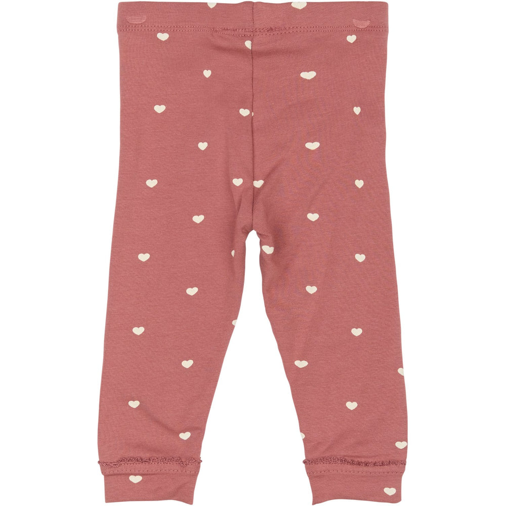 Opdag de charmerende TNSBNova Leggings i withered rose med søde hjerteprint, perfekte til leg og læring. Disse leggings er skabt i GOTS-certificeret økologisk bomuld, som sikrer en blød og strækbar kvalitet. Den komfortable pasform og de elastiske egenskaber giver din lille frihed til at bevæge sig ubesværet. Det fortryllende design med bølgede kanter ved benåbningerne tilfører et feminint touch, der vil se bedårende ud i enhver situation. Leggingsene er tilgængelige i to forskellige farver og kan kombineres med den matchende TNSBNova Bodysuit for et komplet og stilfuldt sæt.