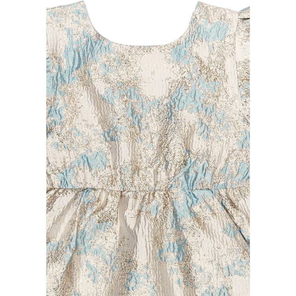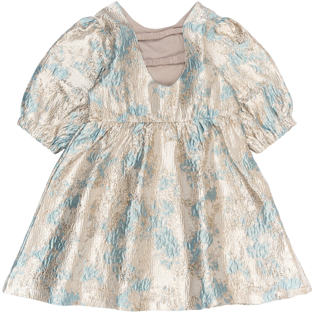 Denne charmerende børnekjole fra THE NEW er designet med et glitrende brokademønster i gyldne og blå toner, der tilføjer et elegant præg. Kjolens A-silhuet og de korte pufærmer kombinerer stil med komfort, mens den elastiske talje sikrer en perfekt pasform. Det unikke åbne rygstykke med elastik accentuerer det moderne design, perfekt til enhver festlig lejlighed. En ideel kombination af skønhed og funktionalitet.