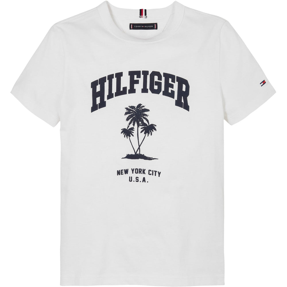 Oplev Tommy Hilfiger White Hilfiger Palm Print T-skjorten, perfekt til børn, der elsker stil og komfort. Fremstillet i blødt materiale sikrer denne T-skjorte optimal bærekomfort og bevægelsesfrihed. Det iøjnefaldende palmeprint og den klassiske hvide farve gør den ideel til enhver lejlighed. Let at vedligeholde og ideel til daglig brug.