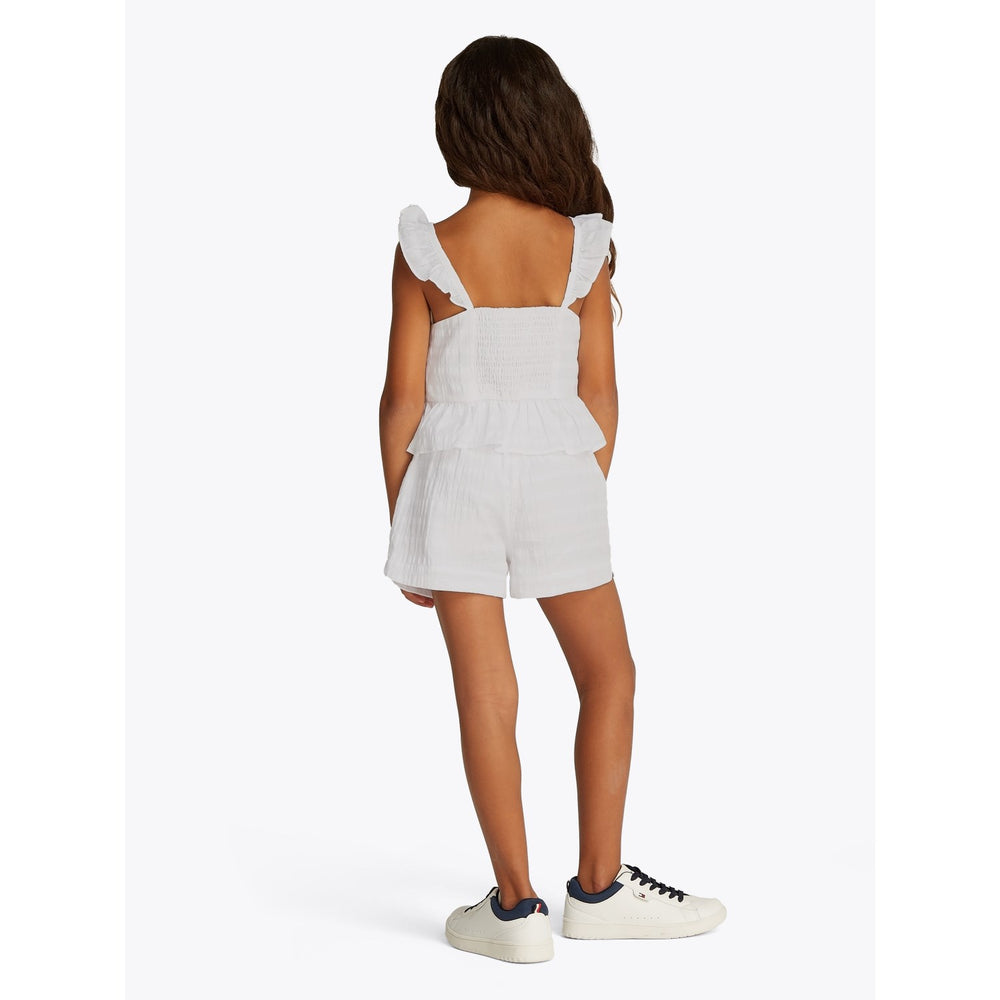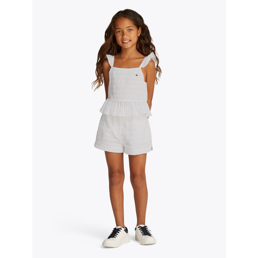 Tag et kig på denne charmerende hvide top fra Tommy Hilfiger, perfekt til dit barns garderobe. Fremstillet i blød, tekstureret bomuld, sikrer den både komfort og holdbarhed. Det klassiske design med subtile detaljer giver et tidløst look, mens pasformen er ideel til leg og hverdagsbrug. En nem at vedligeholde beklædningsdel, der passer perfekt til aktive børn.