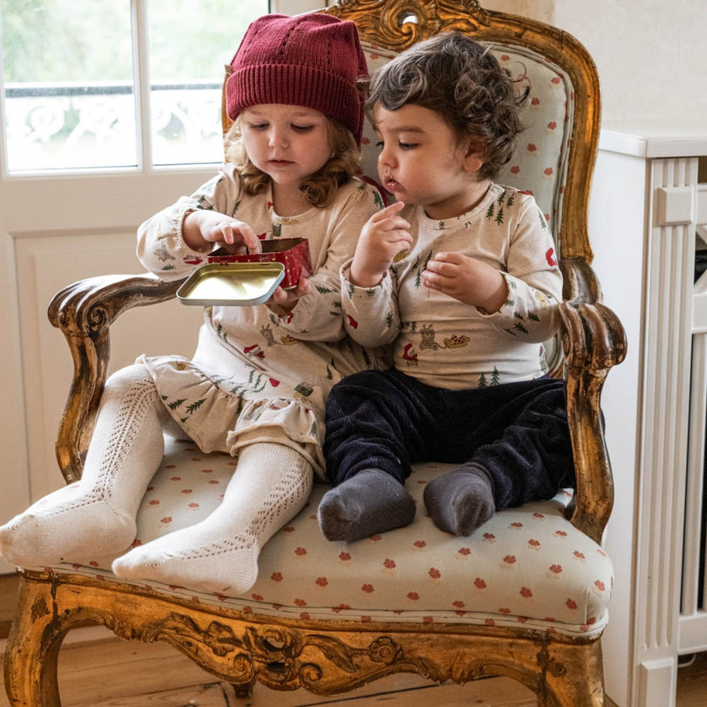 Gør julen ekstra festlig for de små med Marthine Kjolen fra That's Mine, prydet med et charmerende jule-isbjørneprint. Denne kjole har fine flæsedetaljer ved bunden og elastiske ærmer for optimal bevægelsesfrihed. En praktisk trykknap bagpå gør påklædningen let og ubesværet.