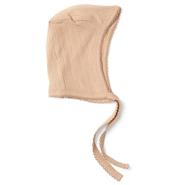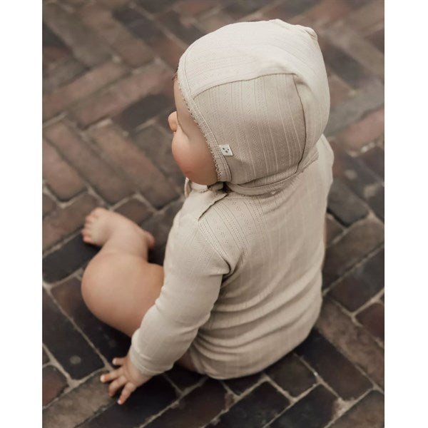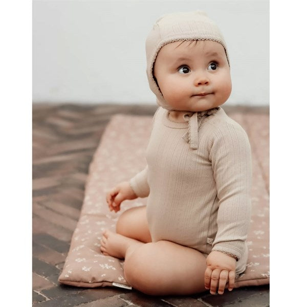 Skøn babyhue fra That's Mine i serien Safari Anna, perfekt til de køligere dage. Huen er fremstillet i blødt, åndbart materiale med et delikat hulmønster, der tilføjer en elegant touch. Det praktiske bindebånd sikrer, at huen bliver siddende komfortabelt på dit barns hoved. Den lyse nuance gør den let at matche med resten af din lille skats garderobe.