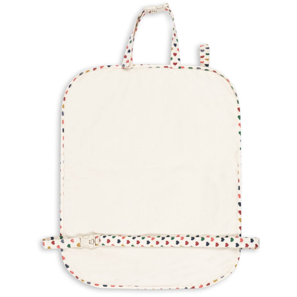 Gør bilturen lettere og mere organiseret med Konges Sløjd Coeur Coloré Opbevaring til Bil. Denne smarte bilarrangør er fremstillet af 100% økologisk bomuld og fyldt med 100% genanvendt polyester, hvilket gør den både miljøvenlig og holdbar. Med justerbare stropper, der let fastgøres til bilens nakkestøtte eller autostol, er den ideel til familiens behov. Arrangøren inkluderer specialdesignede lommer til alt fra vådservietter til tablets, samt en elastisk rem med velcrolukning til legetøj eller sutteetui, så alt er inden for rækkevidde.