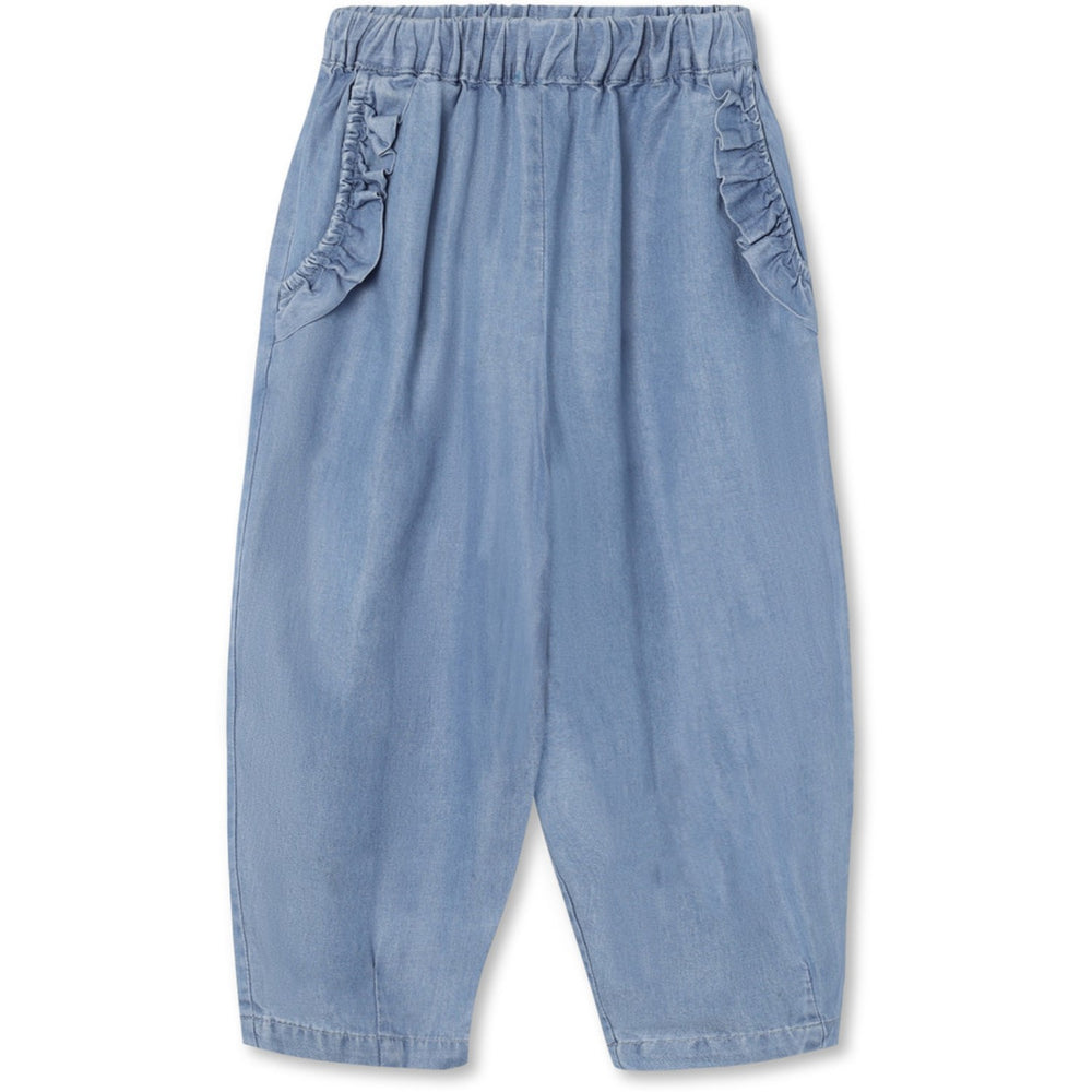 Oplev HELLENE bukserne i medium denimblå, perfekt til dit barns garderobe. Disse bukser er fremstillet af 100% Tencel, der sikrer en blød og behagelig følelse. Designet inkluderer charmerende skrå lommer med flæser og en unik detalje bagpå – en lomme med flæsekanter og et sødt broderi af en hjerteballon. Den løse pasform giver optimal bevægelsesfrihed. Velegnet til maskinvask ved 30°C.