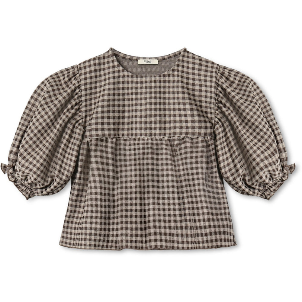 Denne ternet bluse fra Fliink Sandshell / Coffee Bean kombinerer stil og komfort. Fremstillet af en blanding af 30% genanvendt polyester, 39% polyester og 1% elastan, sikrer blusen blødhed og fleksibilitet. Designet med 3/4-puffærmer og taljerynker tilføjer volumen og gør den ideel til aktiv leg. Blusen er let at vedligeholde med maskinvask ved 30°C og er kompatibel med ELLA PANT for et koordineret look.