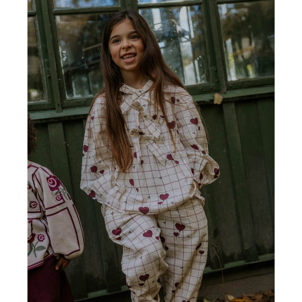 Langærmet bluse i 100% blød bomuld sikrer komfort hele dagen for de mindste. Denne charmerende bluse har et unikt tern- og hjerteballonprint, som tilføjer en legesyg touch til børnegarderoben. Designet med voluminøse ærmer og rynkeeffekt ved skuldrene samt praktiske elastikmanchetter for optimal pasform. Den runde halsudskæring og de stofbeklædte knapper ved skulderen gør påklædning let. En indsyet søm ved taljen udvider sig i et flatterende skørt, hvilket tilfører ekstra volumen og stil. Kan vaskes i maskine ved 30°C på skånsomt program.