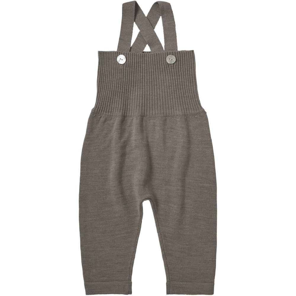 Disse smækbukser i højtaljede Hazel Melange er fremstillet af 100% OEKOTEX, RWS og BLUESIGN certificeret merinould, hvilket sikrer et miljøansvarligt valg. Med elegante perlemorsknapper og justerbare, krydsede seler tilbyder de en perfekt pasform og nem tilpasning. Den ribstrikkede front tilføjer en charmerende detalje, og takket være den specielle behandling af garnet, kan overallsene nemt maskinvaskes på uldprogram uden bekymringer om skadelig kemi.