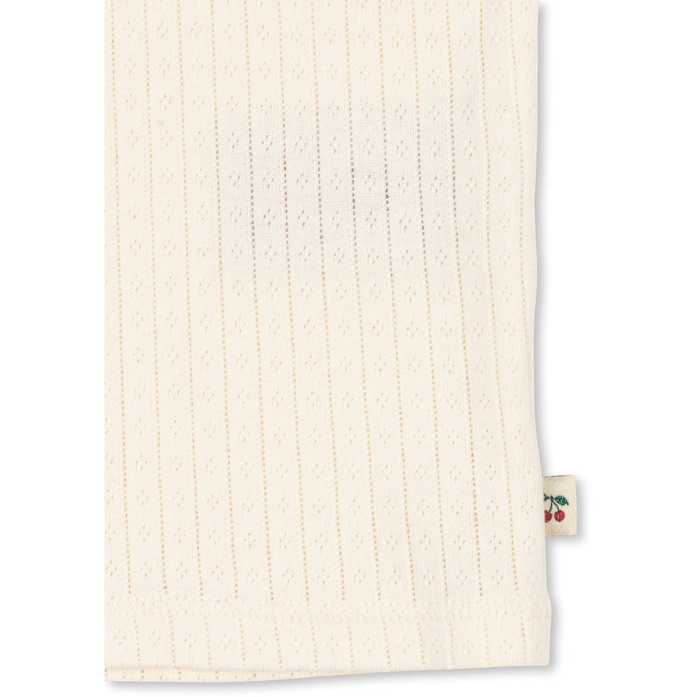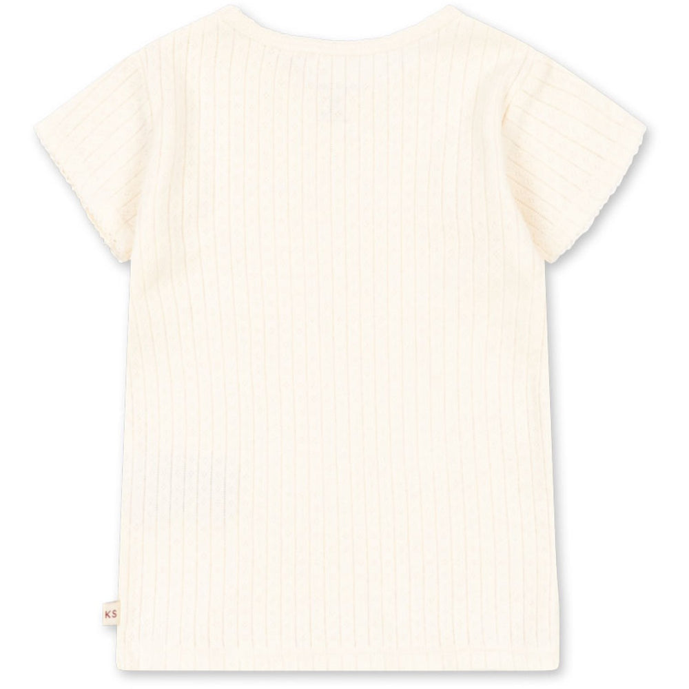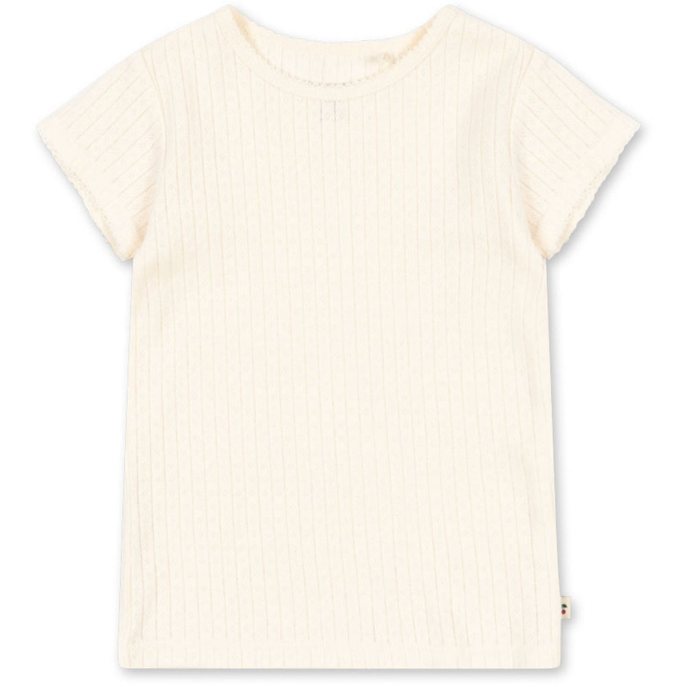 Gør hverdagen lidt sødere med Konges Sløjd Antique White Minnie Tee. Denne charmerende t-shirt er fremstillet af 100% økologisk bomuld, hvilket sikrer blødhed og åndbarhed. Det fine pointelle-mønster og picot-sømmen tilføjer et dekorativt touch, mens den rolige antikhvide farve gør den let at matche med andet tøj. Perfekt til en komfortabel og stilfuld dag i børnehaven eller på legepladsen.