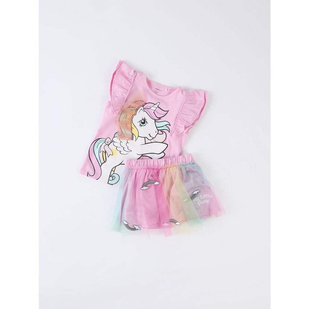 Opfrisk din lille ones garderobe med denne charmerende 'Name It Pink Frosting Mika My Little Pony Top'. Lavet af blød og strækbar jersey, der sikrer optimal komfort og frihed til leg. T-shirten fremhæver yndlingsfigurerne fra My Little Pony i et farverigt gummiprint, der føles blød mod huden. Med sit klassiske snit, runde hals og korte ærmer er denne top ideel til både hverdagsbrug og særlige anledninger. Praktisk og let at vedligeholde, så dit barn kan fortsætte eventyret dag efter dag.
