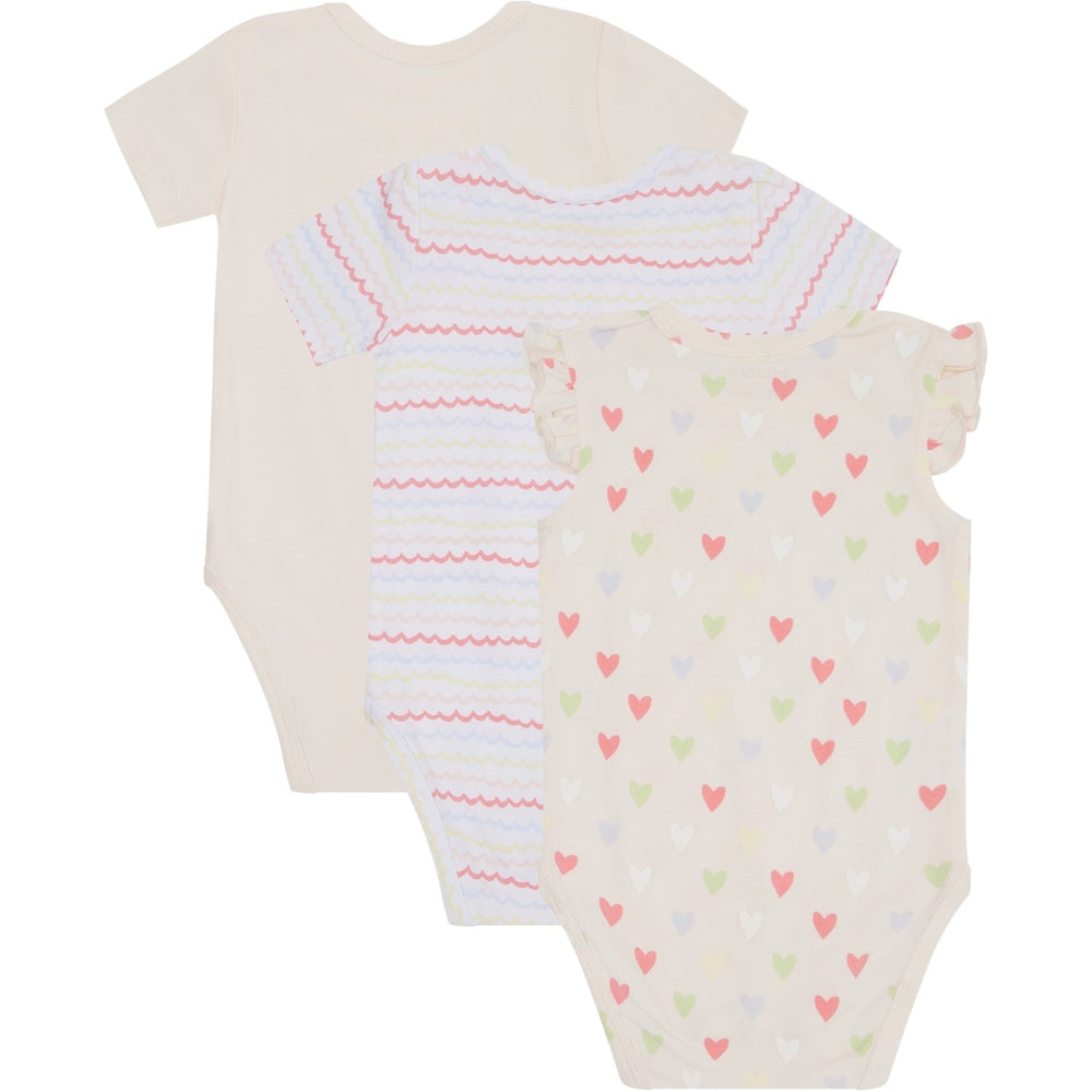 Vores Hust & Claire White Bella Body 3-pak tilbyder en trio af charmerende bodystockings til de små. Disse bløde og strækbare bomuldsbodystockings kommer i tre forskellige designs: bølgeprint med rynk detaljer ved halsen, hjerteprint med søde flæsede ærmer og en legesyg is-print på brystet. Praktiske knaplukninger på venstre skulder og mellem benene gør påklædning og bleskift nemt og hurtig.