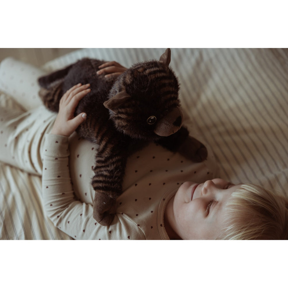 Oplev ro og tryghed med Astrup Tyngdedyr, Kat, 1,2 kg. Denne charmerende tyngdekat med sin fløjlsbløde sort og grå pels og livagtige sorte øjne er perfekt designet til at skabe en beroligende atmosfære for dit barn. Den milde vægt af tyngdekatten hjælper med at mindske angst og uro og sikrer en dyb og fredelig afslapning.