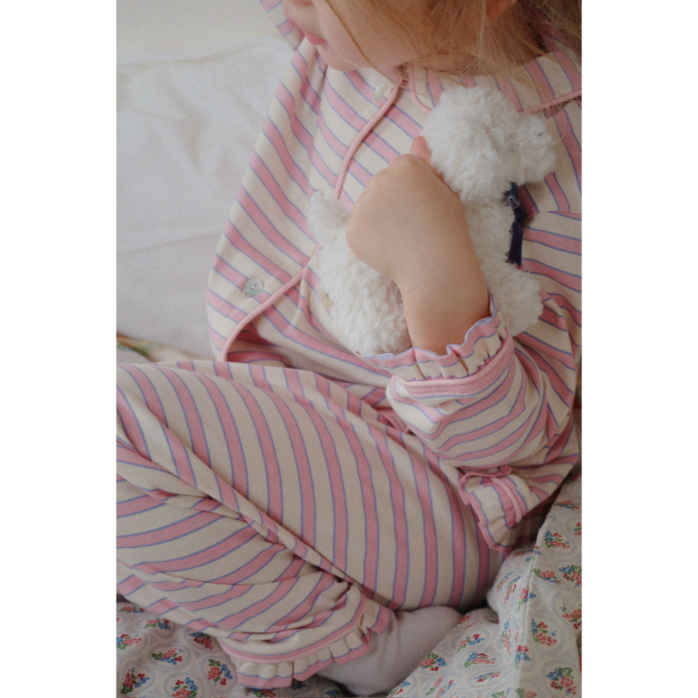 Giv dit barn komfort og stil med Konges Sløjd Lolly Stripe Pio Flæse Sæt. Dette pyjamassæt, perfekt til rolige dage hjemme, er fremstillet i 100% økologisk bomuld, der sikrer blødhed mod huden. Sættet består af en klassisk pyjamasskjorte og matchende bukser udsmykket med charmerende flæsedetaljer, der tilføjer et sødt touch. Både skjorte og bukser er designet for at tilbyde en behagelig pasform og fri bevægelighed. Dette GOTS-certificerede sæt er ikke kun komfortabelt men også fremstillet med omtanke for kvalitet og miljø.