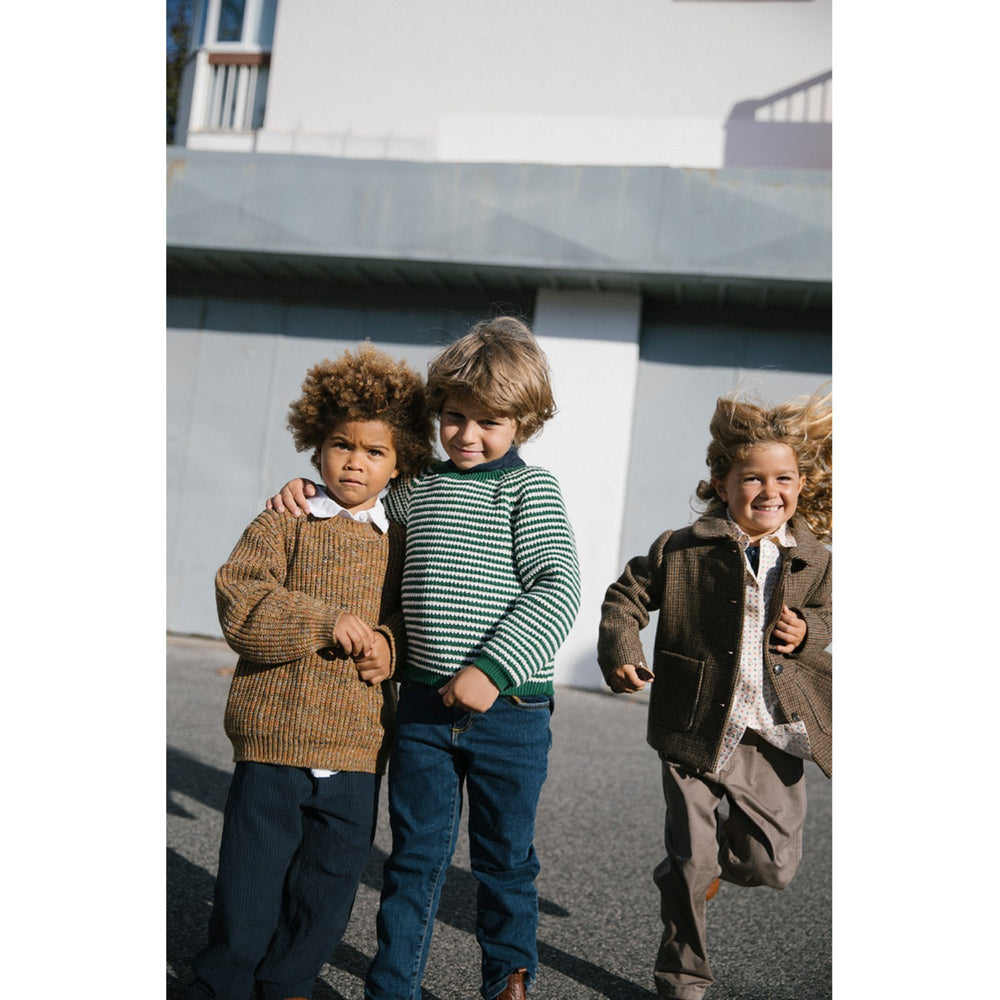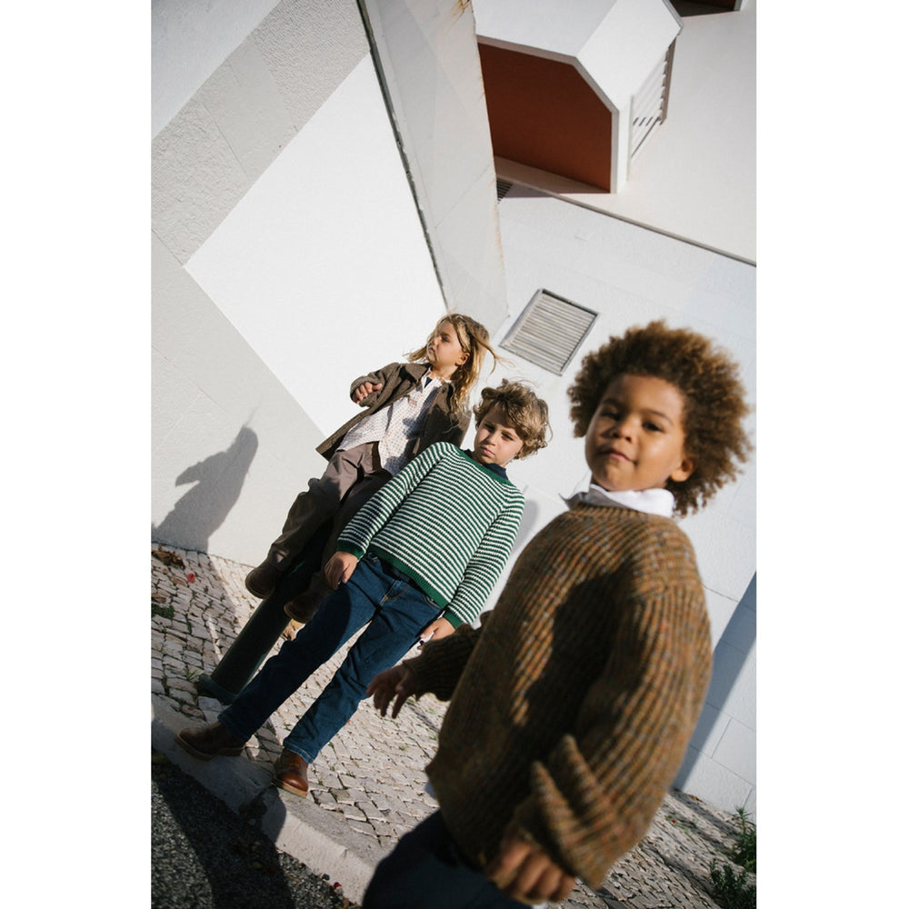 Lad dit barn opleve den ultimative behagelighed med MarMar Cotton Knit Spacedye Dark Bronze Space Teno strik. Denne klassiske langærmede sweater er fremstillet i blødt, meleret garn og designet med en rund halsudskæring, der sikrer en komfortabel pasform. Perfekt til hverdagsbrug og særlige anledninger.