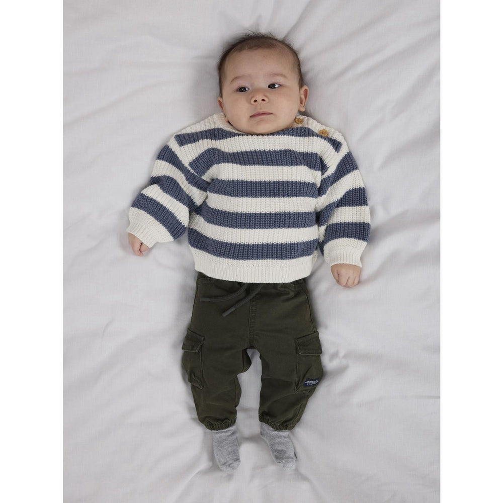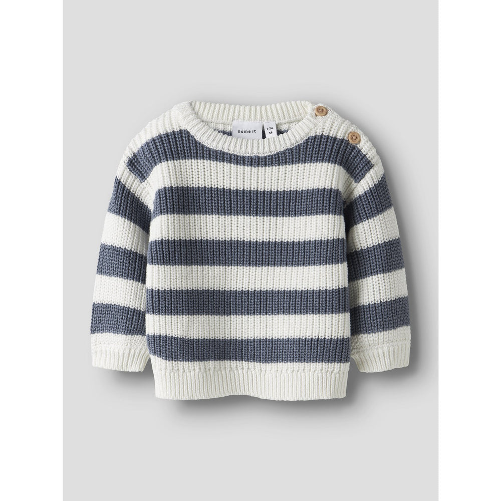 Giv dit barn varme og stil med denne strikkede Nbmolfert pullover fra Name It. Fortryllende i 'Cloud Dancer Flintstone' farve, designet med en iøjnefaldende struktur, der tilføjer en 3D-effekt. Pulloveren har en klassisk rund hals, lange ærmer og praktiske ribmanchetter for optimal pasform. Afsluttes med knaplukning for let påklædning. Denne behagelige strik er ideel til både leg og afslapning, og holder dit barn godt tilpas gennem alle aktiviteter.