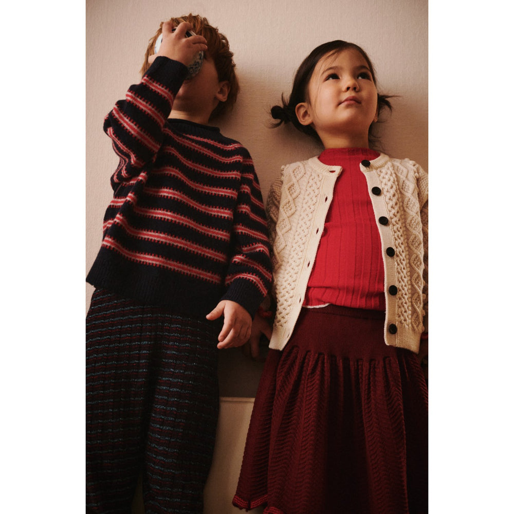 Denne nydelige babycardigan er håndværket af 100% OEKOTEX-®, RWS- og BLUESIGN-certificeret® merinould, hvilket sikrer et højt niveau af både kvalitet og miljøansvar. Designet med en klassisk rund hals, praktiske corozo nød knapper og charmerende grafisk Aran mønster, kombinerer denne cardigan stil med funktionalitet. Den afslappede pasform og de bløde ribkanter tilbyder komfort, mens den specielle behandling af garnet gør cardiganen let at vedligeholde, da den kan maskinvaskes. Sikker og komfortabel for dit barn, denne cardigan vil holde de små varme på kølige dage.