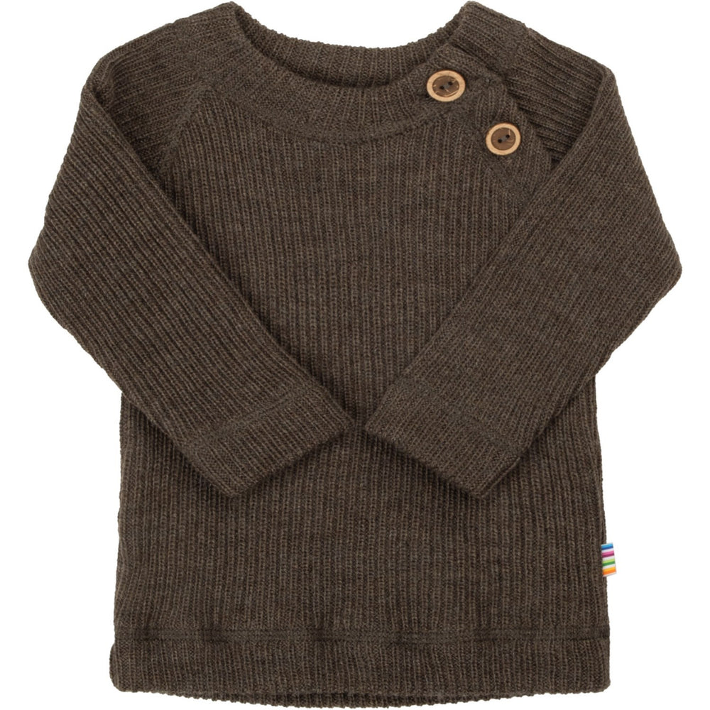 Denne bluse fra Joha er fremstillet i ren merinould, som er kendt for sin blødhed og elasticitet, hvilket sikrer en behagelig pasform for dit barn. Designet med skrå lukning, udsmykket med elegante kokosknapper, og ensfarvet brun melange, tilbyder den både stil og funktion. Tøjets ribstrik forstærker komforten, mens Oeko-tex 100 certificeringen garanterer at materialerne er fri for skadelige stoffer.
