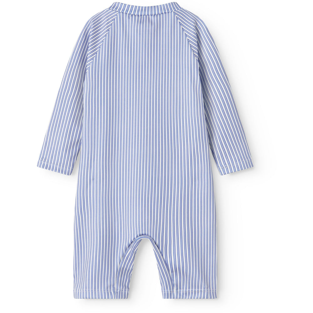 Oplev komfort og stil med MarMar Swim Print Bolich Blue Stripe Swal badeheldragten. Denne dragt er designet med både ærmer og ben til ekstra beskyttelse og har en praktisk lynlås foran, gør den let at tage på og af. De blå og hvide striber tilføjer et frisk pust til barnets sommergarderobe. Passer perfekt til leg og svømning.