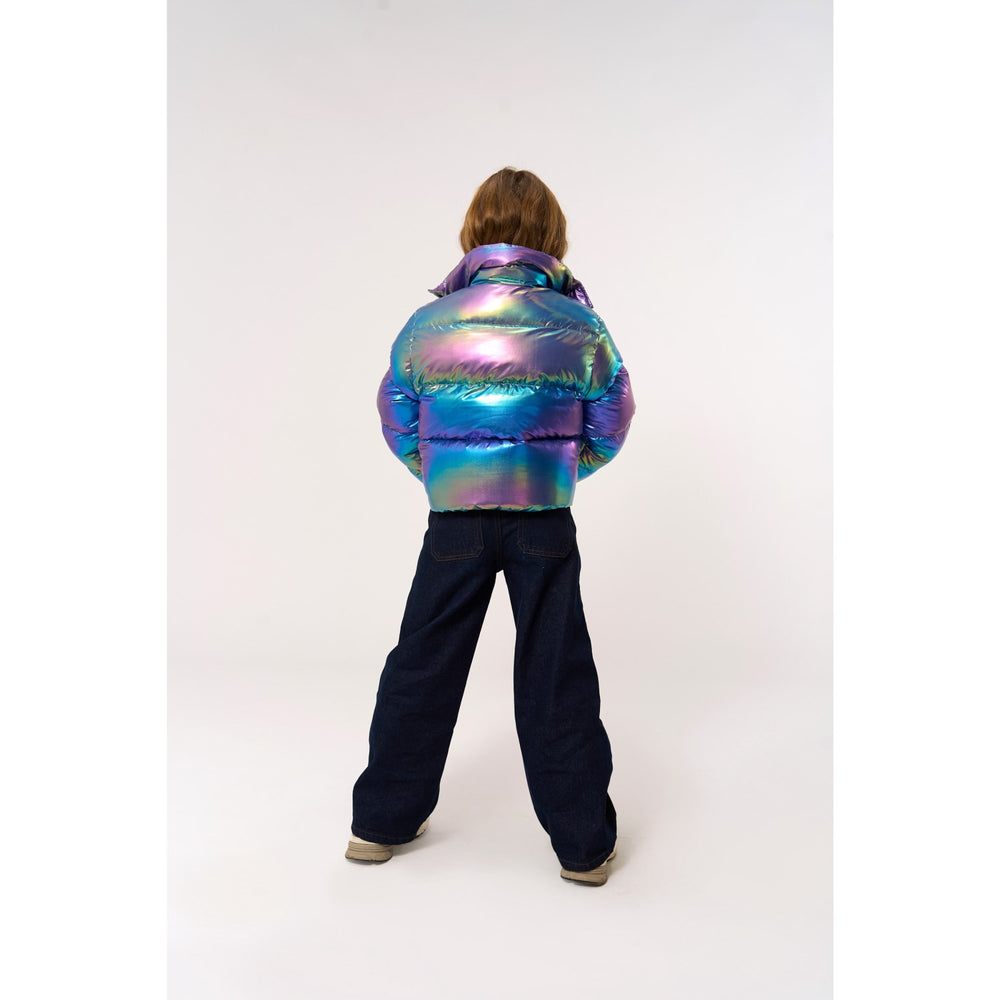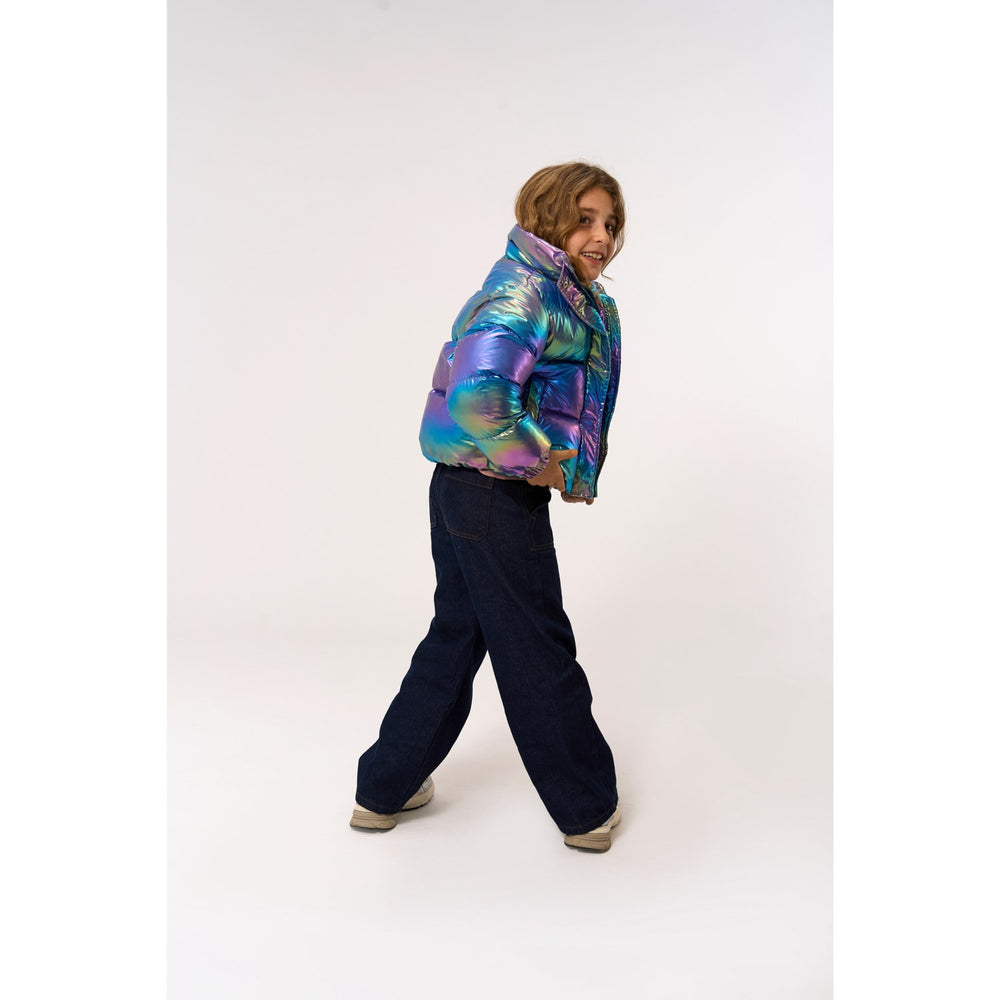 Denne vandafvisende dunjakke er perfekt til børn til kølige dage i efteråret og vinteren. Jakken har en skinnende, metallisk finish, der tilføjer stil og farve til børnenes hverdagsgarderobe. Den quiltede design sikrer komfort og varme, mens den almindelige pasform giver god bevægelsesfrihed. Let at vedligeholde og holdbar til både leg og udflugter.