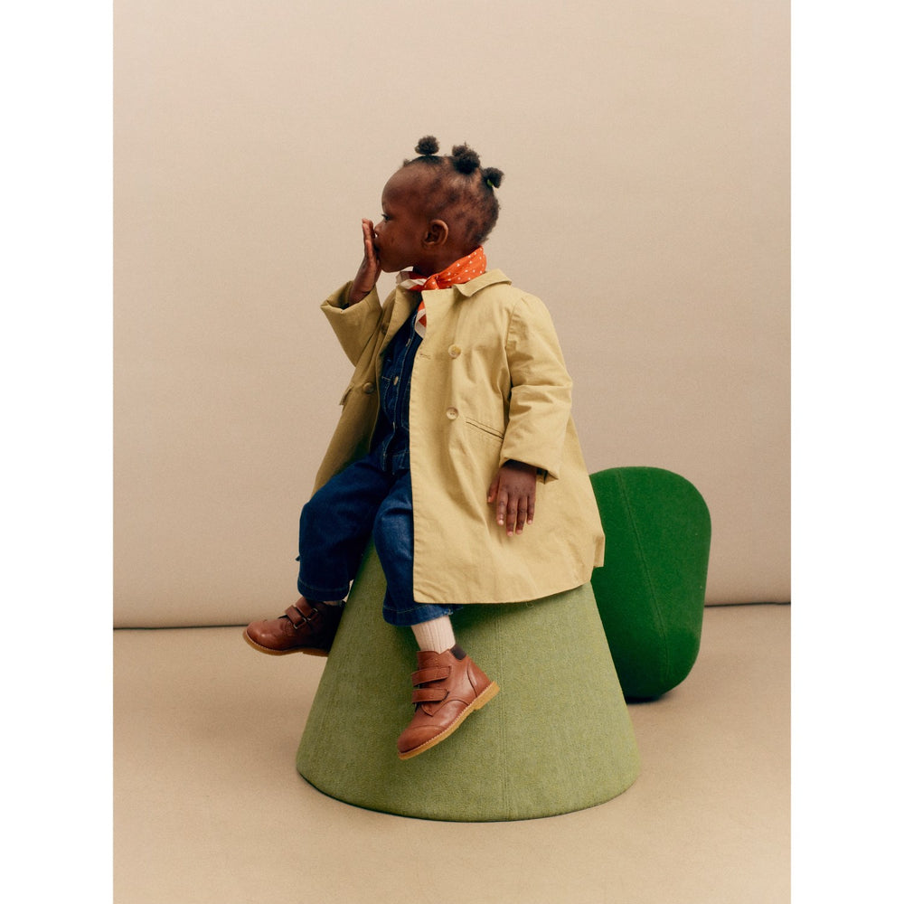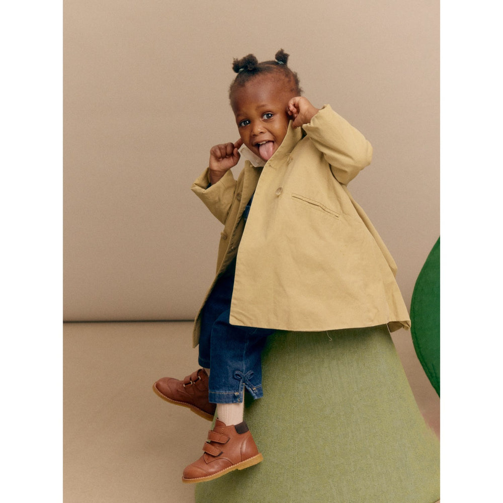 Opdag varme og stil med Angulus Cognac/Dark Brown Begynder TEX-støvle, perfekt til de første skridt. Disse støvler er fremstillet af holdbart læder med en PFAS-fri TEX-membran, som sikrer små fødder forbliver tørre og komfortable i al slags vejr. Det naturlige og åndbare læder sammen med en blød og fleksibel FSC-certificeret rågummisål, sikrer både miljøvenlighed og støtte til barnets fod. Designet omfatter justerbare velcroremme, der giver et personligt fit, og en polstret ruskindskrave der tilføjer ekstra stabilitet. Støvlerne er designet i Danmark og kærligt håndlavede i Portugal, hvilket garanterer høj kvalitet og etisk produktion. Sørg for at måle barnets fod og tillæg 1-1,2 cm for optimalt voksetillæg.