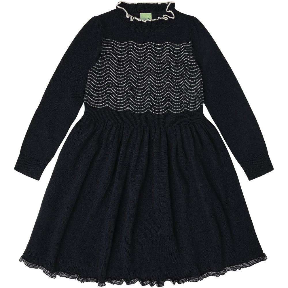 Lad dit barn opleve den ultimative komfort og stil med denne elegante mørkeblå kjole i knælang design. Fremstillet i 100% OEKOTEX®-, RWS- og BLUESIGN-certificeret merinould, sikrer denne kjole, at dit barn klædes både ansvarligt og moderne. Kjolens unikke flæsekrave med kontrastkant tilføjer en charmerende detalje, mens ribkanten og de lange ærmer tilbyder behagelig pasform. Det dekorative tofarvede pointellemønster på forkroppen samt blød ribtalje, der frembringer flotte læg i nederdelen, fuldender looket. Desuden er garnet behandlet for at være maskinvaskbart uden skadelige kemikalier, hvilket gør vedligeholdelsen nem og bekvem.