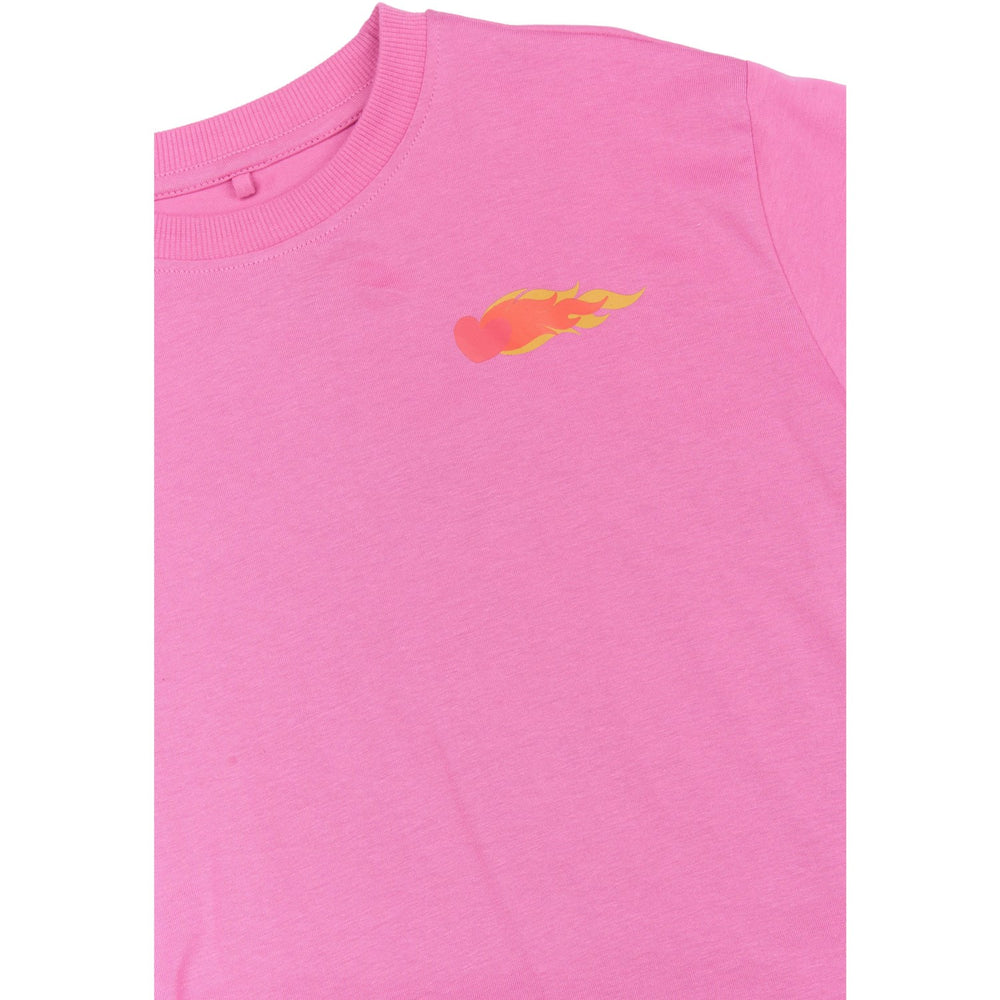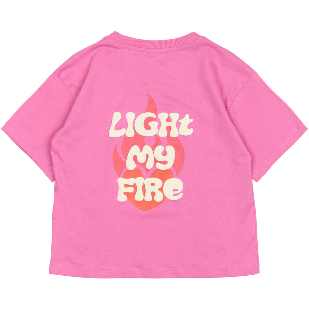 Opgrader dit barns garderobe med denne farverige oversized t-shirt fra THE NEW. Fremstillet i blød GOTS økologisk certificeret bomuld sikrer den komfort hele dagen. T-shirten prydes af et charmerende flammeprint og teksten "Light My Fire", der tilføjer en sjov og unik detalje. Med sin rummelige pasform og klassiske runde halsudskæring er denne t-shirt ideel til både leg og afslapning. Kombiner den med jeans eller shorts for et stilfuldt, afslappet look.