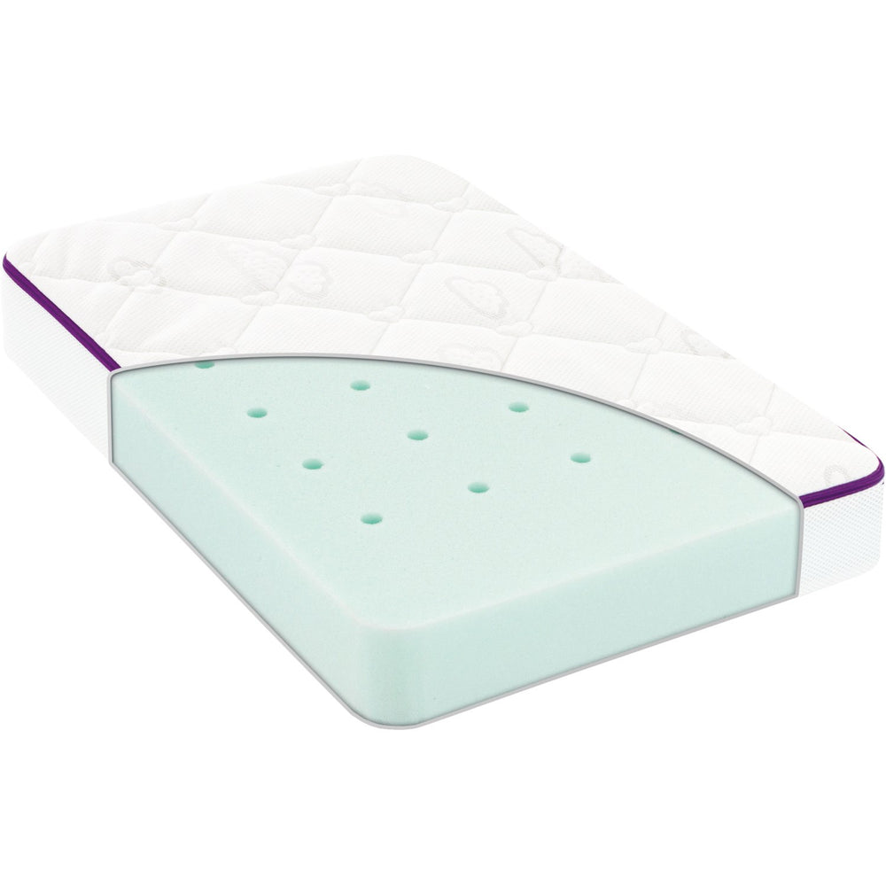 Det bløde, quiltede TENCEL™/polyester-betræk er ikke kun behageligt mod sart hud, men det er også nemt at vedligeholde med dets aftagelige og vaskbare design. En praktisk lynlås, udstyret med børnesikring, fuldender madrassen, så den er både sikker og simpel at rense ved eventuelle småuheld.