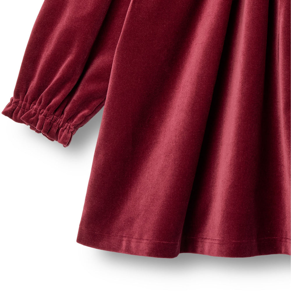 Denne charmerende langærmede Wheat Ruby Red kjole er perfekt til børnenes garderobe med sin bløde, økologiske bomuld. Kjolen har en behagelig løs pasform og en praktisk længde over knæene, som sikrer bevægelsesfrihed. Med fine detaljer som rynker under brystet og elastik ved håndleddene, samt en dekorativ lille bomuldsblonde ved ærmekanten, kombinerer den klassisk stil med nutidens komfort. Knaplukningen på bagsiden gør det let for dit barn at tage kjolen på og af. Denne model er ikke bare stilfuld men også praktisk og behagelig for aktiv leg. Fremstillet af 100% GOTS-certificeret økologisk bomuld, er den et sundt valg for dit barn og miljøet.