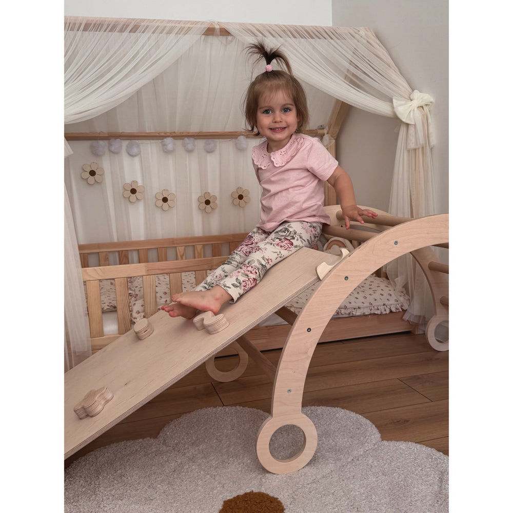 - 3-i-1 Montessori-legesæt med en naturlig trævippe, en blød pude og en slide-climber