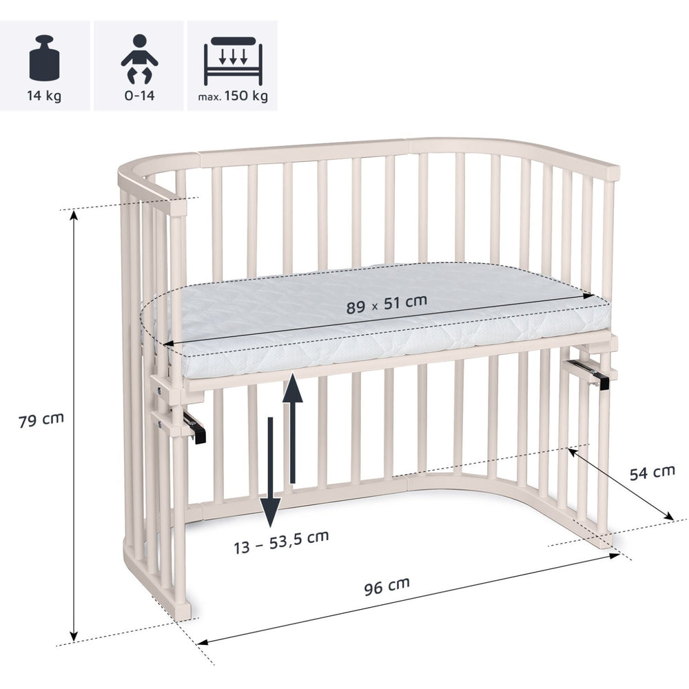 babybay® Maxi i en flot Beige farve er ideel til dig, der ønsker ekstra plads til din baby – eller til tvillinger. Den passer tæt op ad forældresengen uden mellemrum takket være den patenterede, trinløse højdejustering.