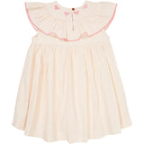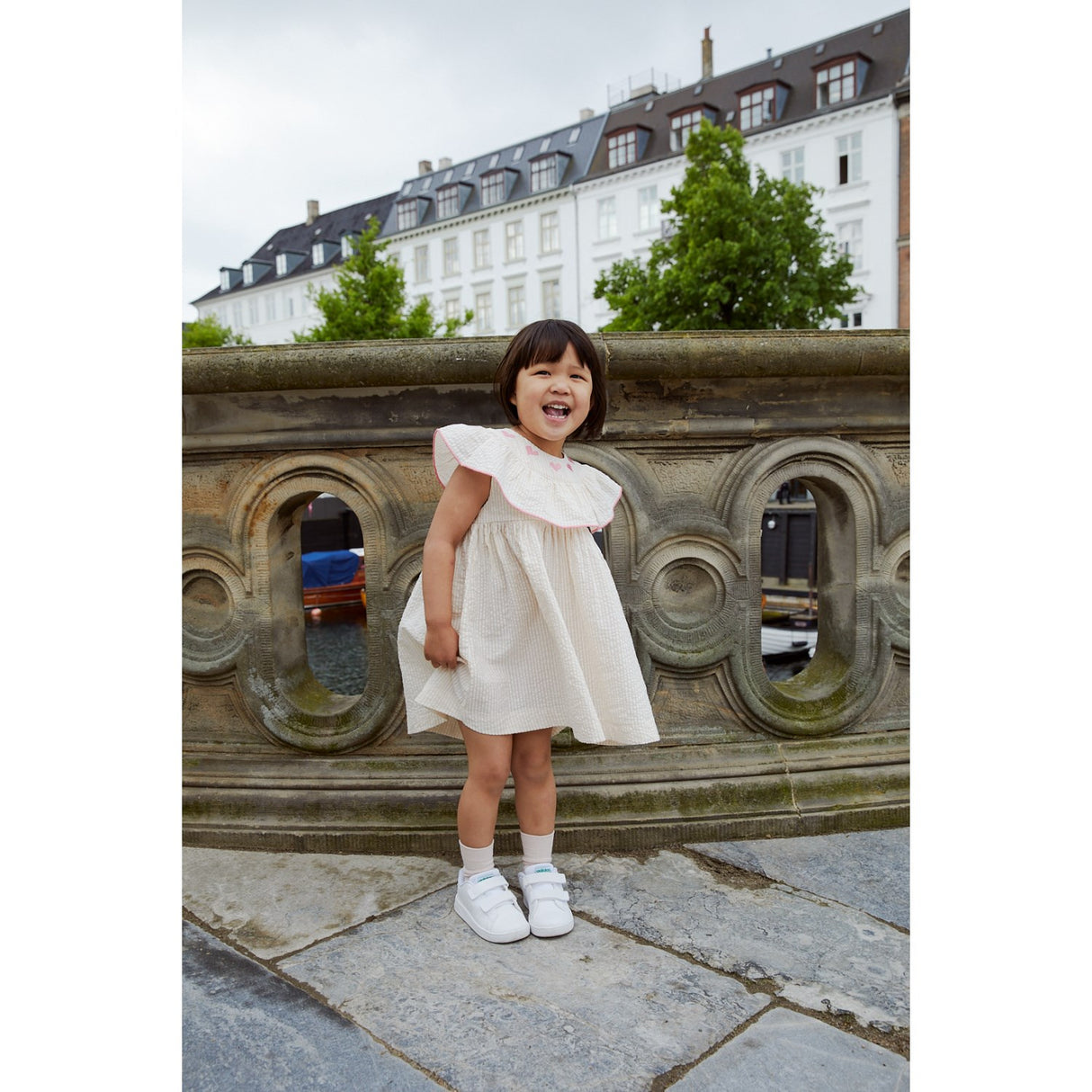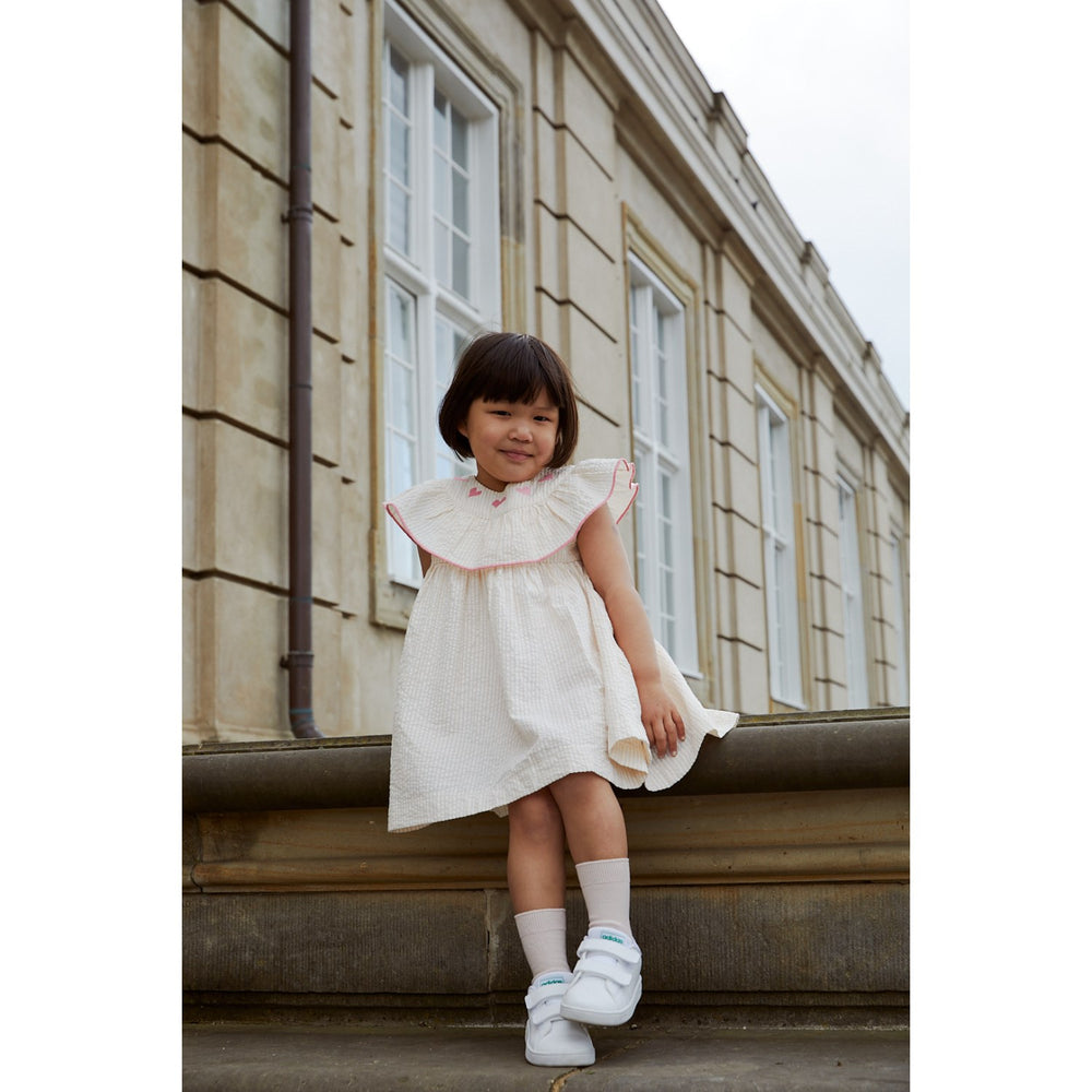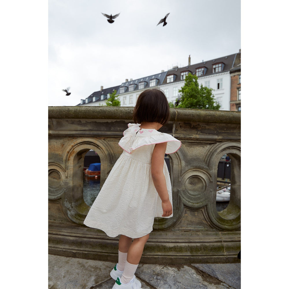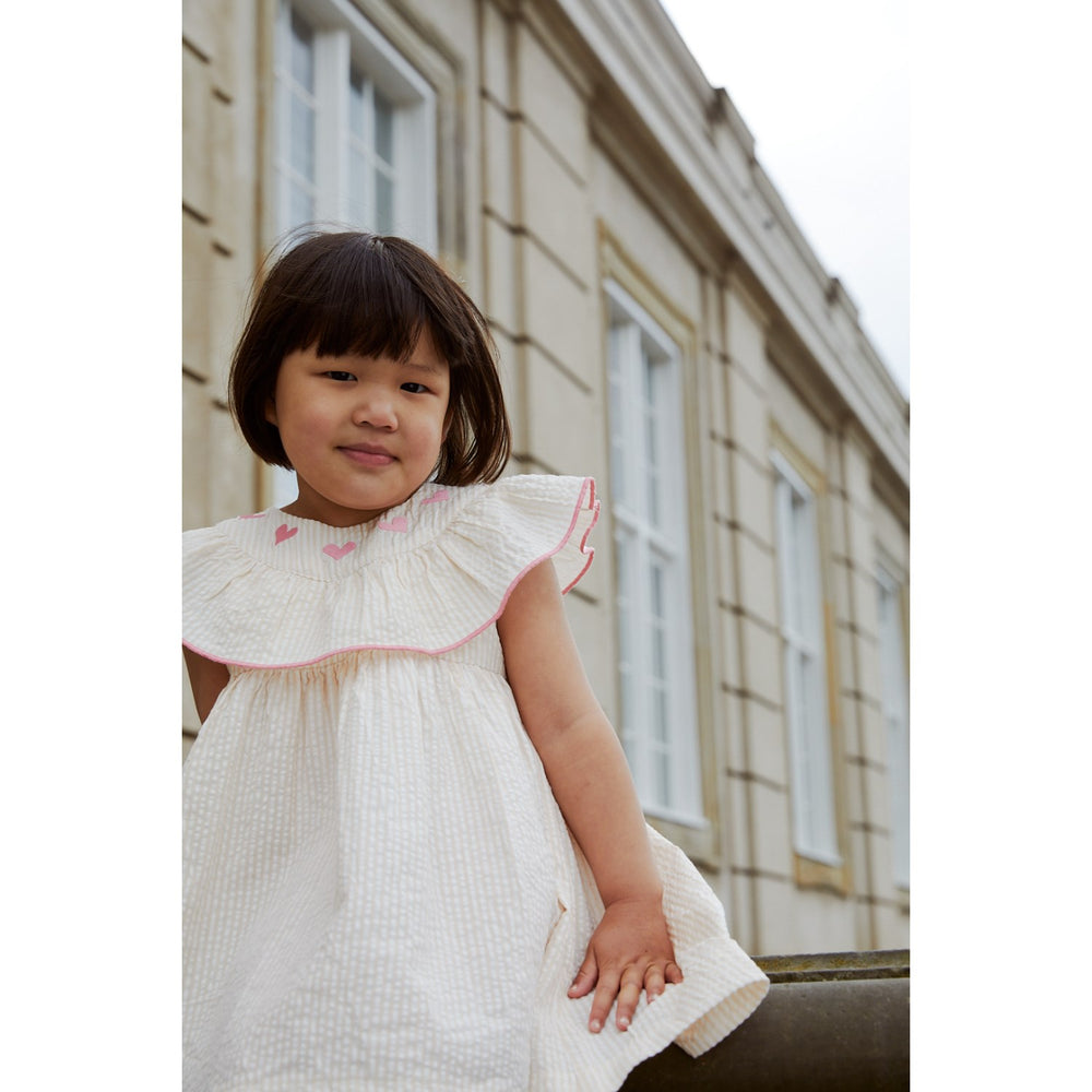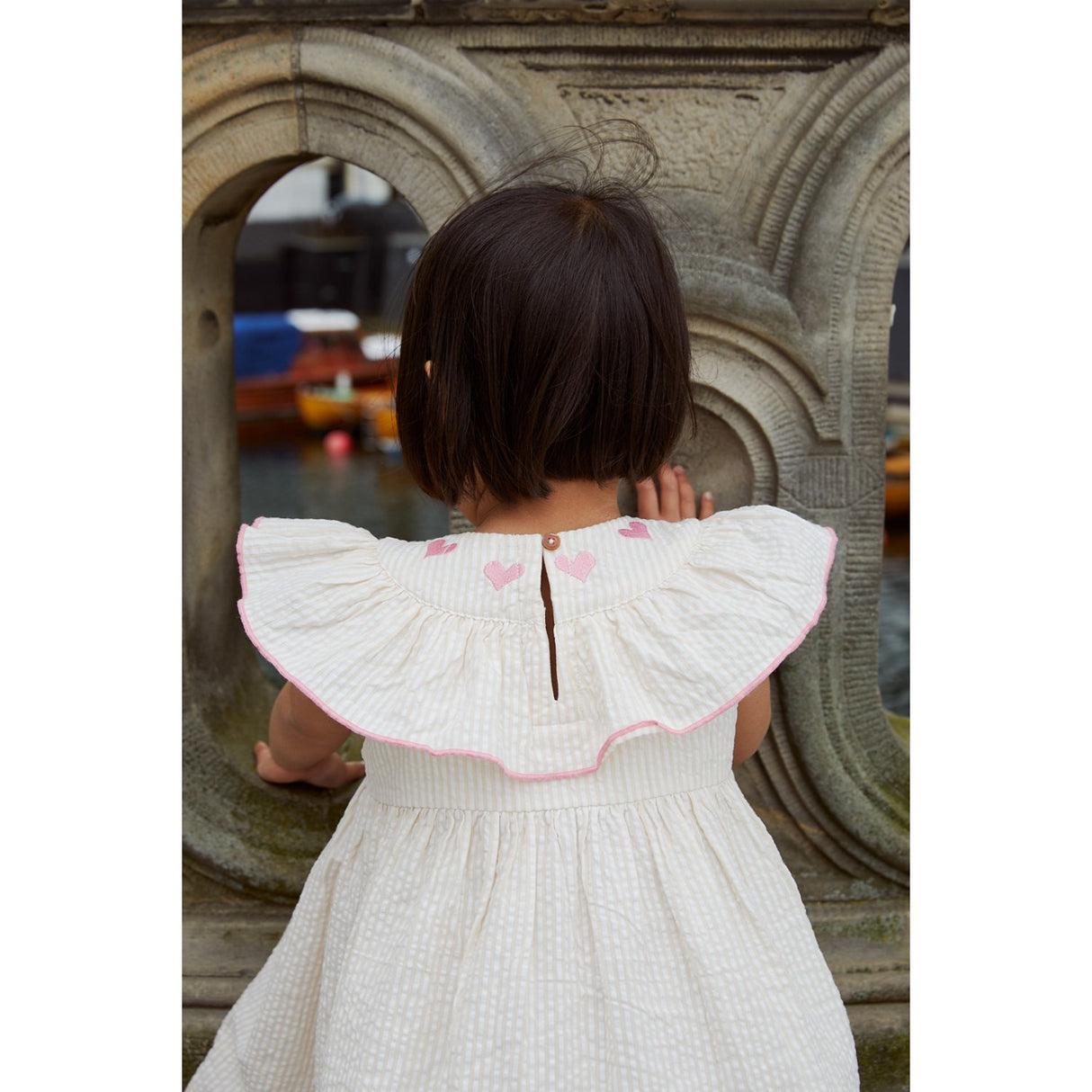 Klæd din lille op i denne charmerende seersucker-kjole med hjertebroderier nær den flotte flæsekrave. Fremstillet i 100% økologisk bomuld, garanterer denne kjole både blødhed og holdbarhed. Tøjets seersucker-stof er ikke kun behageligt men også dekoreret med fine cream og rosa striber, der tilføjer et tidsløst touch. Perfekt til aktive børn, kjolen understøtter fri bevægelse og er nem at vedligeholde; den bevarer farve og form, selv efter gentagen vask. En ideel tilføjelse til enhver legeklar garderobe.