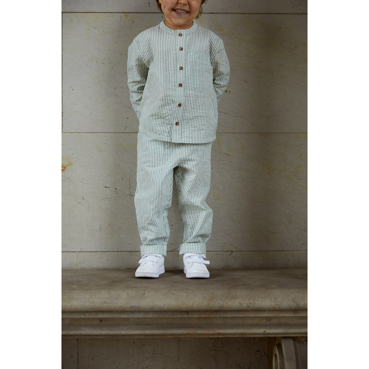 Denne elegante grønne seersucker-skjorte fra Copenhagen Colors er ideel til dit barns garderobe. Skabt af 100% økologisk bomuld sikrer den ikke bare blødhed og komfort, men også en sikker og miljøvenlig løsning. Skjorten, med sin klassiske stribet design og praktiske stolpelukning, er perfekt til aktive børn. Nem at vedligeholde, den kræver blot almindelig maskinvask, og egenskaberne sikrer holdbarhed. Passer til enhver lejlighed, denne skjorte kombinerer stil med funktionel frihed.