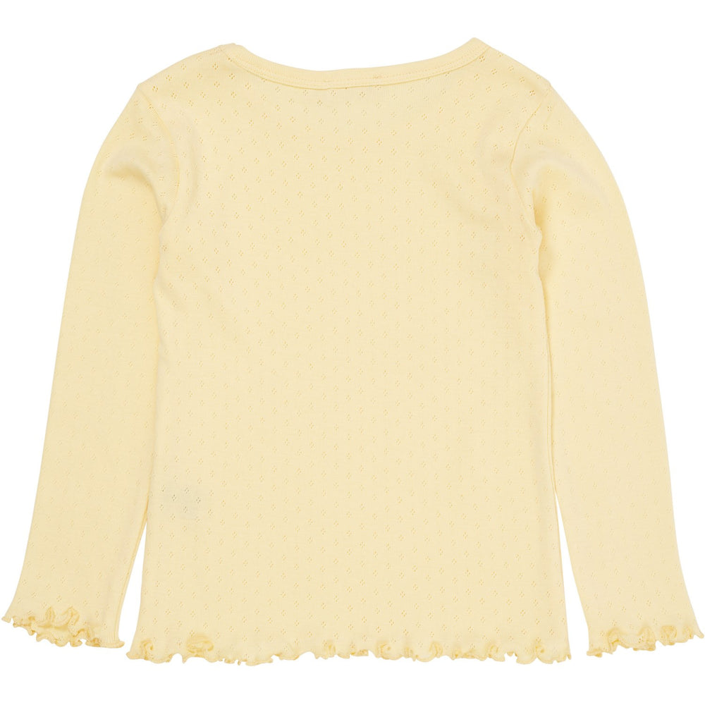 Denne sommerlige langærmede T-shirt fra COPENHAGEN COLORS er skabt i et let og åndbart pointelle-strik, der sikrer ultimativ komfort til dit barn. Den sarte gule farve og det fine mønster tilfører elegant stil, mens den afslappede pasform giver plads til leg og aktivitet. Ideel til at kombinere med både nederdele og leggings, og dens alsidighed gør den perfekt til både sommerbrug og køligere dage.
