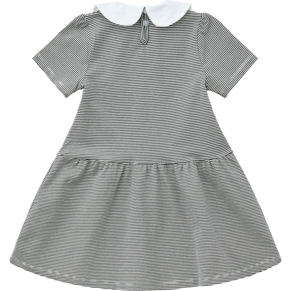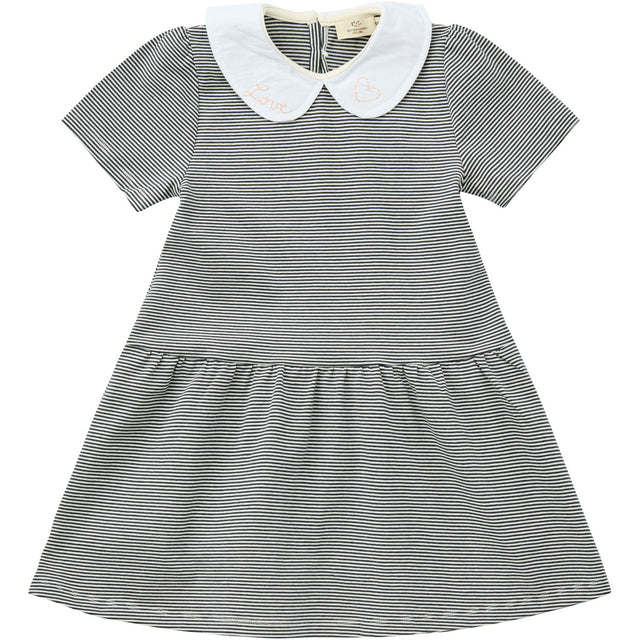 Denne elegante, stribede kjole med charmerende poplinkrave er fremstillet i 100% økologisk bomuld, der sikrer både komfort og kvalitet. Med sit klassiske design og alsidige navy/cream farvepalet, tilbyder den ubesværet stil til børn. Dens pasform er ideel til leg og særlige anledninger. Praktisk vedligehold med maskinvask op til 40 grader og tørretumbling på lav varme.
