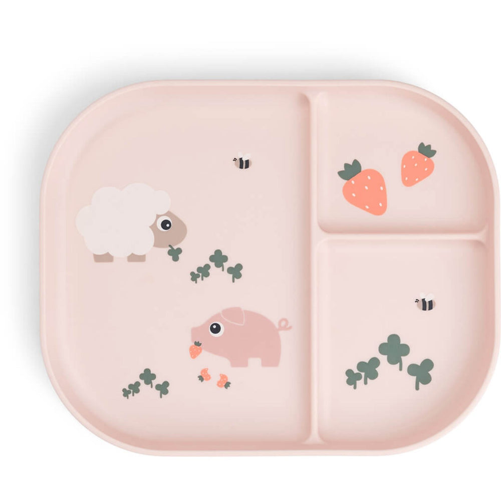 - Ekstra: • En praktisk antiskrid-base sikrer, at tallerkenen bliver på sin plads under måltidet • Tre opdelinger til adskillelse af dit barns mad • Fremstillet af fødevaregodkendt PP, fri for BPA og andre skadelige stoffer • Kan bruges i mikrobølgeovn og vaskes i opvaskemaskine • Materialet er stærkt, langtidsholdbart og genanvendeligt • Sød pudderfarve med et underholdende motiv af Sheepy og Pigee