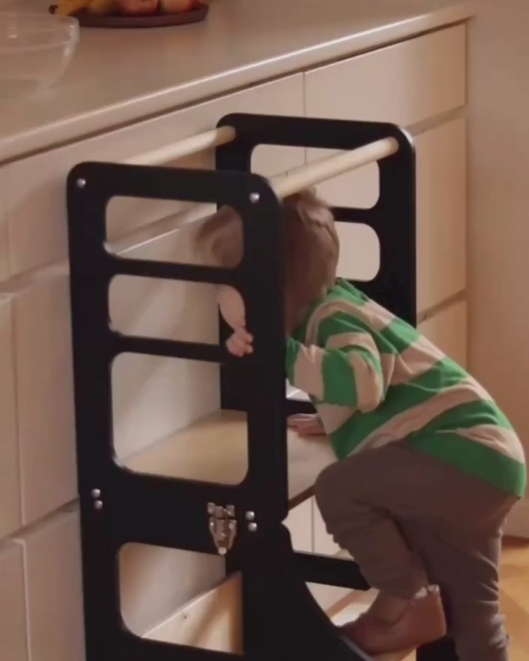 Duck Woodworks Foldbart Læringstårn i sort tilbyder en sikker og stabil platform for dit barns udforskning og læring i køkkenet. Med sin ergonomiske design sikrer det, at dit barn kan nå bordpladen og vasken trygt og komfortabelt, hvilket fremmer uafhængighed og deltagelse i daglige rutiner som madlavning og opvask. Dette alsidige læringstårn kan nemt omdannes til en stol eller et bord, hvilket gør det perfekt til hvil og kreative aktiviteter. Gør familielivet rigere ved at inkludere dit barn i køkkenet med dette foldbare og rumvenlige tårn.