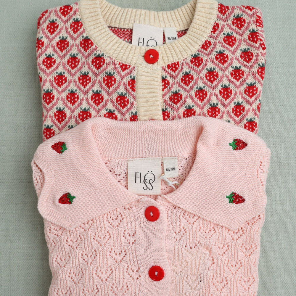 Denne charmerende Isabel Cardigan i strikket pointelle fremstillet af blød økologisk bomuld prydes med en flosset krave dekoreret med søde jordbærbroderier. Røde knapper tilføjer en livlig kontrast. Perfekt til at holde dit barn varmt, mens stil og komfort går hånd i hånd.