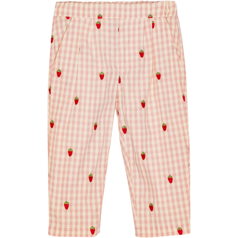 Disse charmerende Dolly bukser prydes af et sødt jordbærbroderi og klassisk lyserød gingham-mønster. Fremstillet af blød økologisk bomuld, sikrer de komfort hele dagen med deres elastiske linning og justerbart snøre. Perfekte til både leg og afslapning.