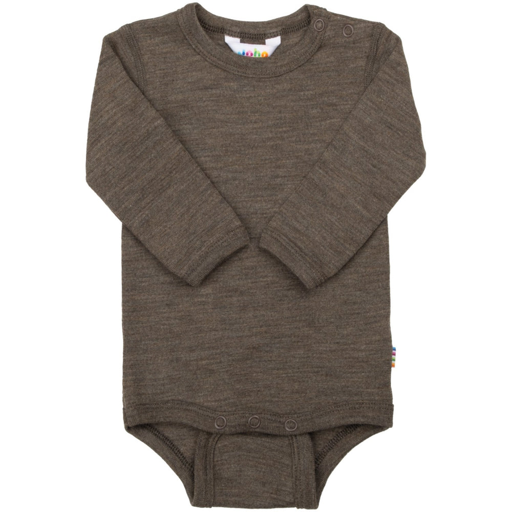Denne behagelige Joha body i brun meleret farve er designet med lange ærmer og praktiske trykknapper på skulderen og mellem benene for nem påklædning. Fremstillet i en blød og let uld-silke blanding. Materialekvaliteten er sikret med Oeko-Tex 100 certificering, hvilket garanterer høj sikkerhed og komfort for dit barns følsomme hud.