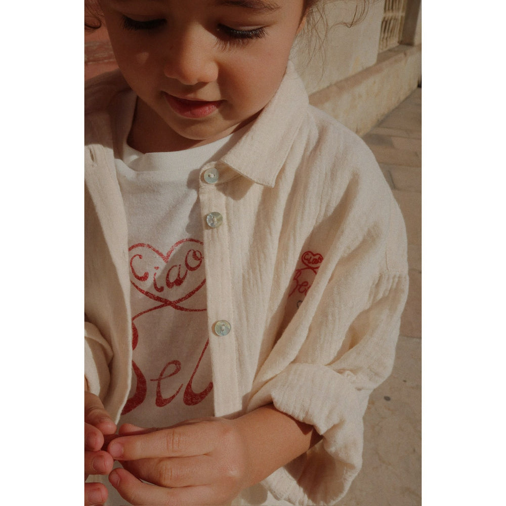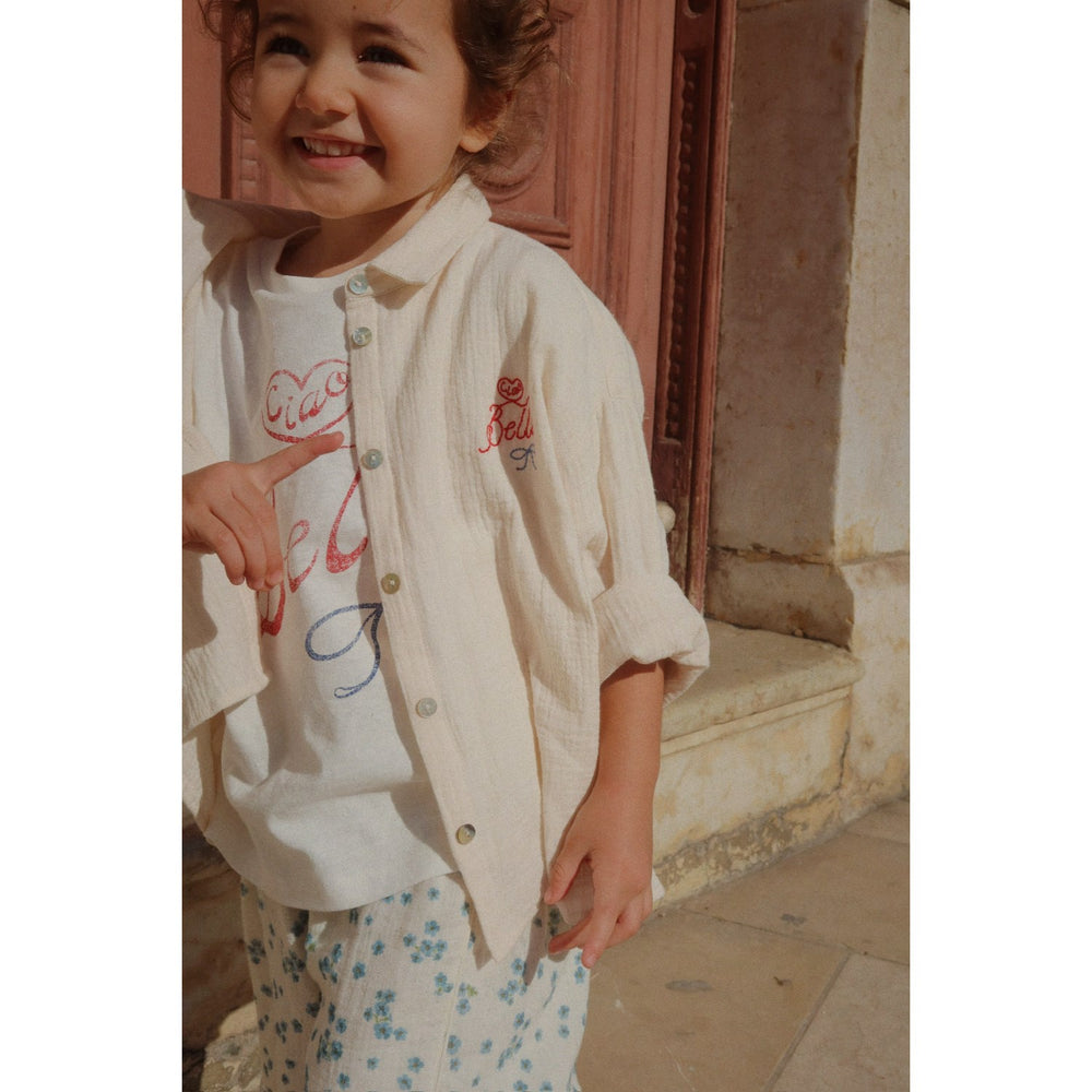Oplev den charmerende Bella skjorte fra Konges Sløjd, perfekt til din lille. Fremstillet i 100% økologisk bomuldsmusselin sikrer den åndbarhed og komfort. Den klassiske krave sammen med elegante perlemorsknapper tilføjer et strejf af stil, mens de forskudte skuldersømme og den søde sløjfe sikrer en afslappet pasform. Skjorten, som bærer det legesyge 'Ciao Bella'-logo, er ikke kun komfortabel men også stilfuld til enhver lejlighed. Certificeret GOTS for kvalitet og miljøvenlig produktion.