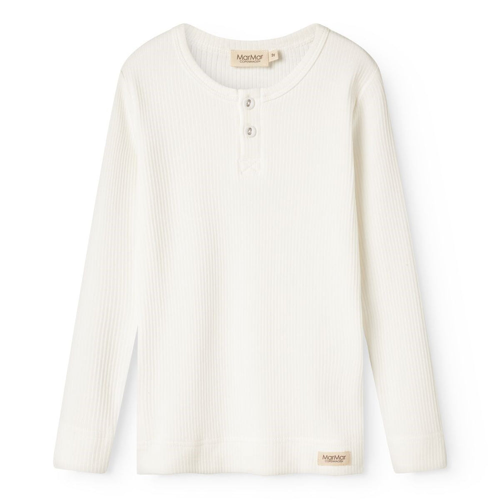 Denne langærmede bluse fra MarMar er fremstillet i blødt modalstof, som sikrer en behagelig pasform til dit barn. T-shirten er udstyret med praktiske knapper, der gør den nem at tage af og på. Det enkle, hvide design gør den let at kombinere med andet tøj i barnets garderobe. Ideal til både hverdag og særlige lejligheder.