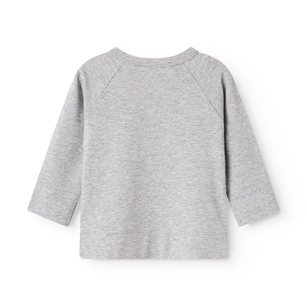 Denne langærmede omslagsbluse i lys gråmeleret farve er perfekt til nyfødte. Designet med let adgang til skift ved hjælp af trykknapper og bånd sikrer en problemfri påklædning. Blusen er fremstillet i blødt modalstof, som er skånsomt mod babyens hud og tilbyder en behagelig pasform. Idealet til hverdagsbrug garanterer blusen både stil og funktionalitet.