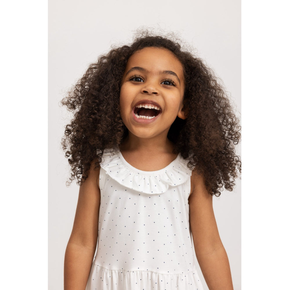 Denne kortærmede stropkjole fra MarMar, model 'Modal Smooth Print Blue Dot Delta', er perfekt til leg og fest. Den charmerende flæsedetalje og prikkede mønster i blå nuancer fremhæver kjolens livlige design. Kjolen er designet til at nå over knæet, hvilket sikrer bevægelsesfrihed for dit barn. Fremstillet i blødt modal, tilbyder den optimal komfort og er nem at vedligeholde.