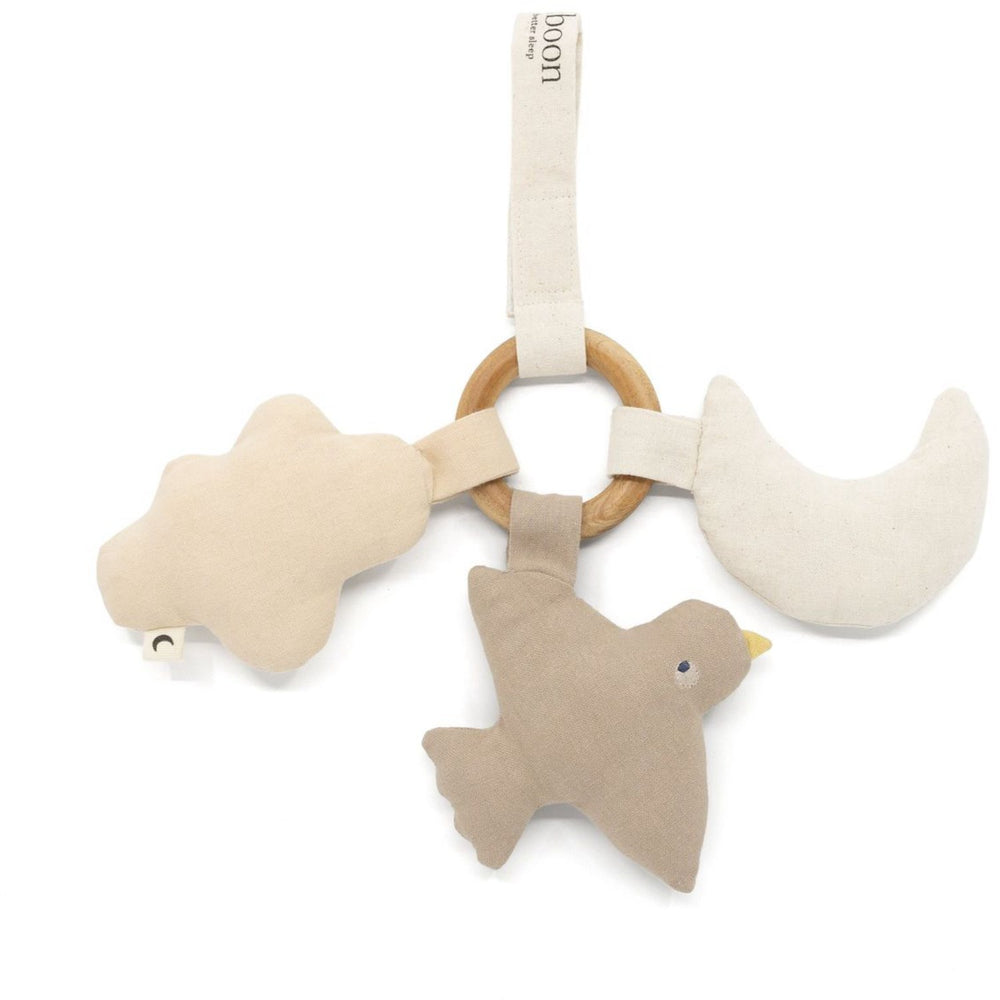 Natbamserne fra Moonboon Rose Mix indbyder til søde drømme med deres bløde design i Ole Lukøje-tema, inklusiv figurer som skyen, månen og fuglen. Fremstillet af 100% økologisk bomuld, garanterer disse natbamser både sikkerhed og komfort for dit barn. Fastgjort til en elegant ring af valnøddetræ, kombinerer de funktionalitet og æstetik til et beroligende sovetilbehør.