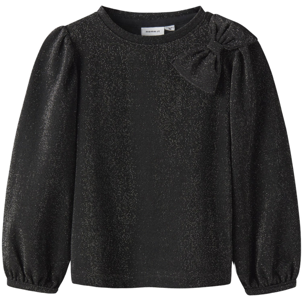Gør barnets garderobe festklar med denne elegante Name It Black Nmfroisin Ls Top. Designet er præget af et iøjnefaldende glitterstof, som giver en skinnende effekt, perfekt til enhver festlig lejlighed. Toppen har en komfortabel slim fit pasform, rund hals og lange ærmer med elastiske manchetter, der sikrer en god pasform. Buedetaljen tilføjer et sødt touch, mens de funklende glitterdetaljer fuldender det glamourøse look. Ideel til at kombinere med en nederdel eller pæne bukser for et fuldendt outfit.